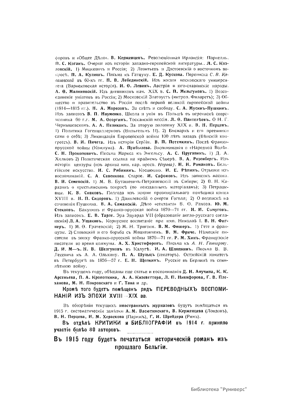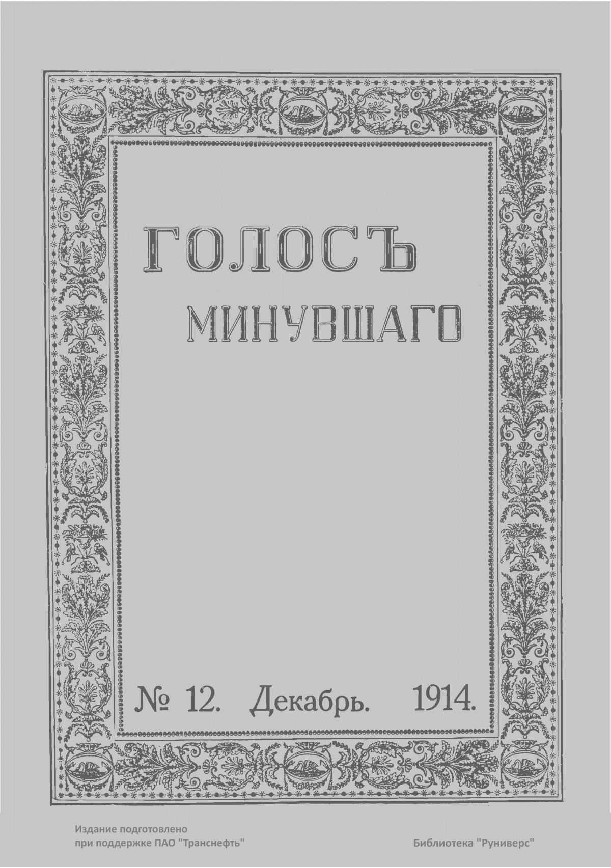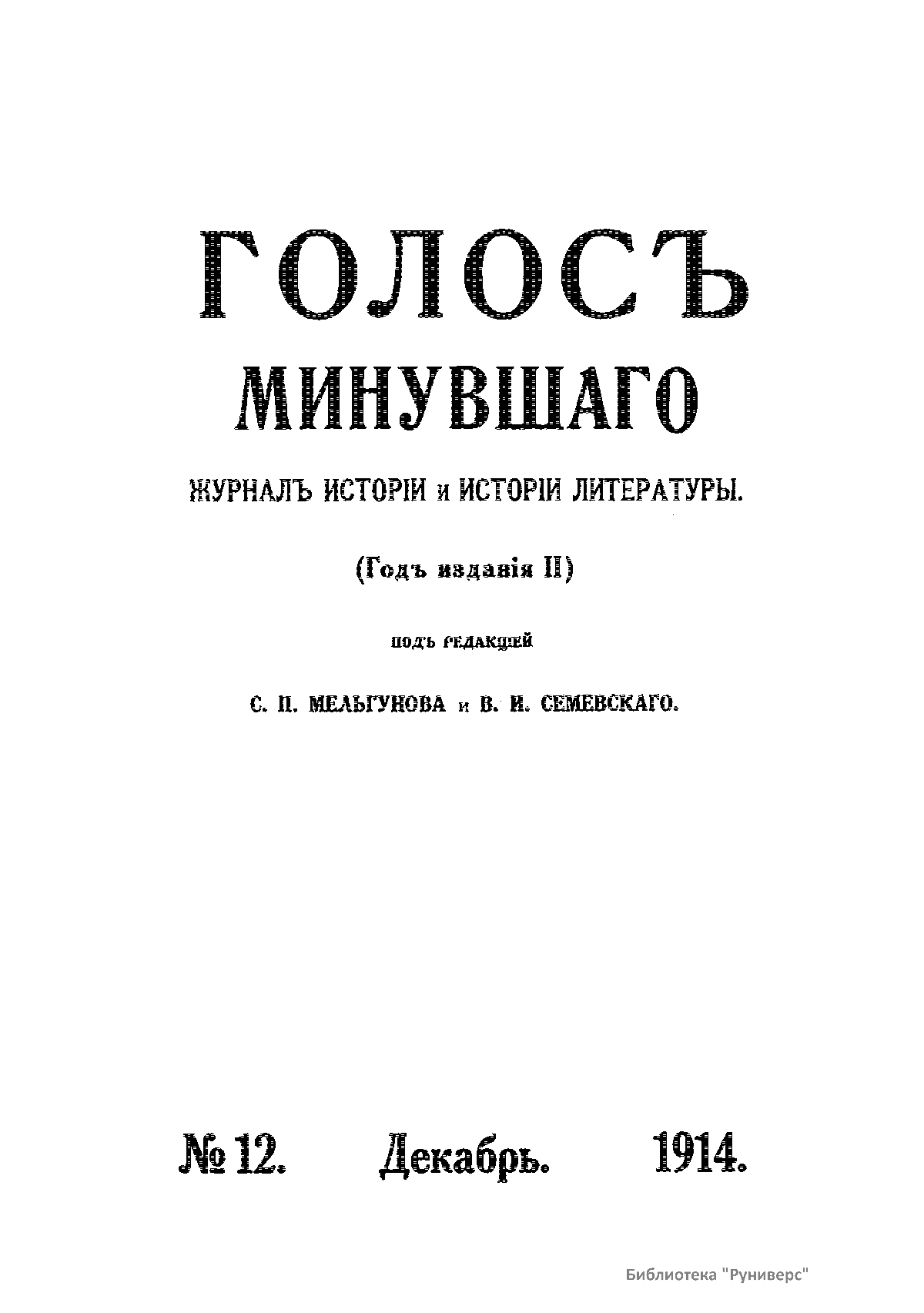«Голос Минувшего» — журнал истории и истории литературы либерально-народнического направления, издававшийся в Москве с 1913 по 1923 год. Издателем журнала в 1913–1922 годах были известные русские историки, публицисты и общественные деятели С. П. Мельгунов (1880–1956) и В. И. Семевский (1848–1916). В редакционную коллегию также входили А. К. Дживелегов и П. Н. Сакулин. До 1919 «Голос минувшего» выходил ежемесячно, затем нерегулярно, всего было выпущено 65 номеров. В журнале публиковались интереснейшие материалы, посвященные истории литературы и общественных движений в России второй половины XVIII – начала XX веков. Здесь можно найти: статьи по вопросам русской и всеобщей истории, истории литературы, философии, искусства и археологии. В издании представлены: историческая беллетристика, биографии русских и иностранных деятелей, критика и библиография, новости русской и иностранной науки, обзор журналов русских и иностранных, хроника, мемуары, записки, дневники и письма декабристов, видных народовольцев и эсеров, крупных общественных деятелей и царских администраторов, писателей, военачальников и др. Среди авторов: Е. В. Тарле, А. Ф. Кони, А. К. Дживелегов, А. А. Кизеветтер, В. Г. Короленко и др. Стремление сделать журнал интересным для более широкого круга читателей способствовало тому, что в «Голосе Минувшего», хоть и в ограниченном количестве, печатались статьи по истории искусства и помещались иллюстрации: портреты, картины и рисунки, не знакомые или мало знакомые публике. В журнале опубликован целый ряд интересных писем, документов и воспоминаний. Абсолютное большинство текстов никогда не переиздавалось. Журнал снабжен указателями имен за 1913–1922 годы и систематическим указателем содержания.