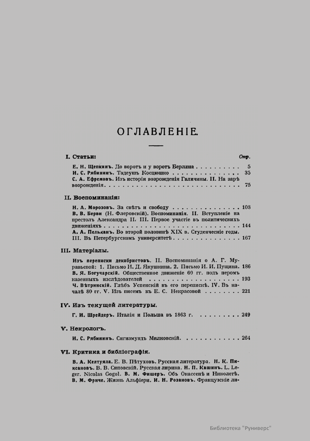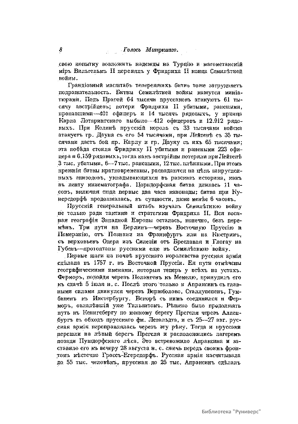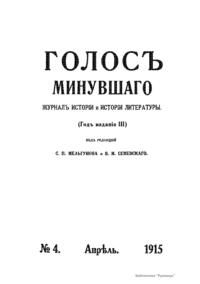 «Голос Минувшего» — журнал истории и истории литературы либерально-народнического направления, издававшийся в Москве с 1913 по 1923 год. Издателем журнала в 1913–1922 годах были известные русские историки, публицисты и общественные деятели С. П. Мельгунов (1880–1956) и В. И. Семевский (1848–1916). В редакционную коллегию также входили А. К. Дживелегов и П. Н. Сакулин. До 1919 «Голос минувшего» выходил ежемесячно, затем нерегулярно, всего было выпущено 65 номеров. В журнале публиковались интереснейшие материалы, посвященные истории литературы и общественных движений в России второй половины XVIII – начала XX веков. Здесь можно найти: статьи по вопросам русской и всеобщей истории, истории литературы, философии, искусства и археологии. В издании представлены: историческая беллетристика, биографии русских и иностранных деятелей, критика и библиография, новости русской и иностранной науки, обзор журналов русских и иностранных, хроника, мемуары, записки, дневники и письма декабристов, видных народовольцев и эсеров, крупных общественных деятелей и царских администраторов, писателей, военачальников и др. Среди авторов: Е. В. Тарле, А. Ф. Кони, А. К. Дживелегов, А. А. Кизеветтер, В. Г. Короленко и др. Стремление сделать журнал интересным для более широкого круга читателей способствовало тому, что в «Голосе Минувшего», хоть и в ограниченном количестве, печатались статьи по истории искусства и помещались иллюстрации: портреты, картины и рисунки, не знакомые или мало знакомые публике. В журнале опубликован целый ряд интересных писем, документов и воспоминаний. Абсолютное большинство текстов никогда не переиздавалось. Журнал снабжен указателями имен за 1913–1922 годы и систематическим указателем содержания.