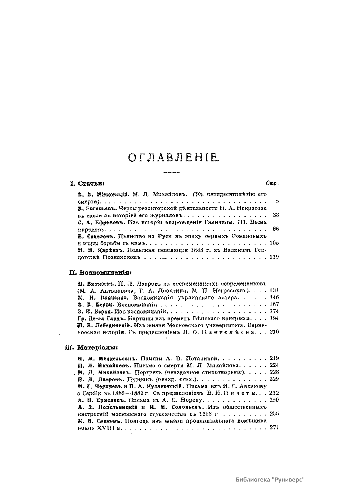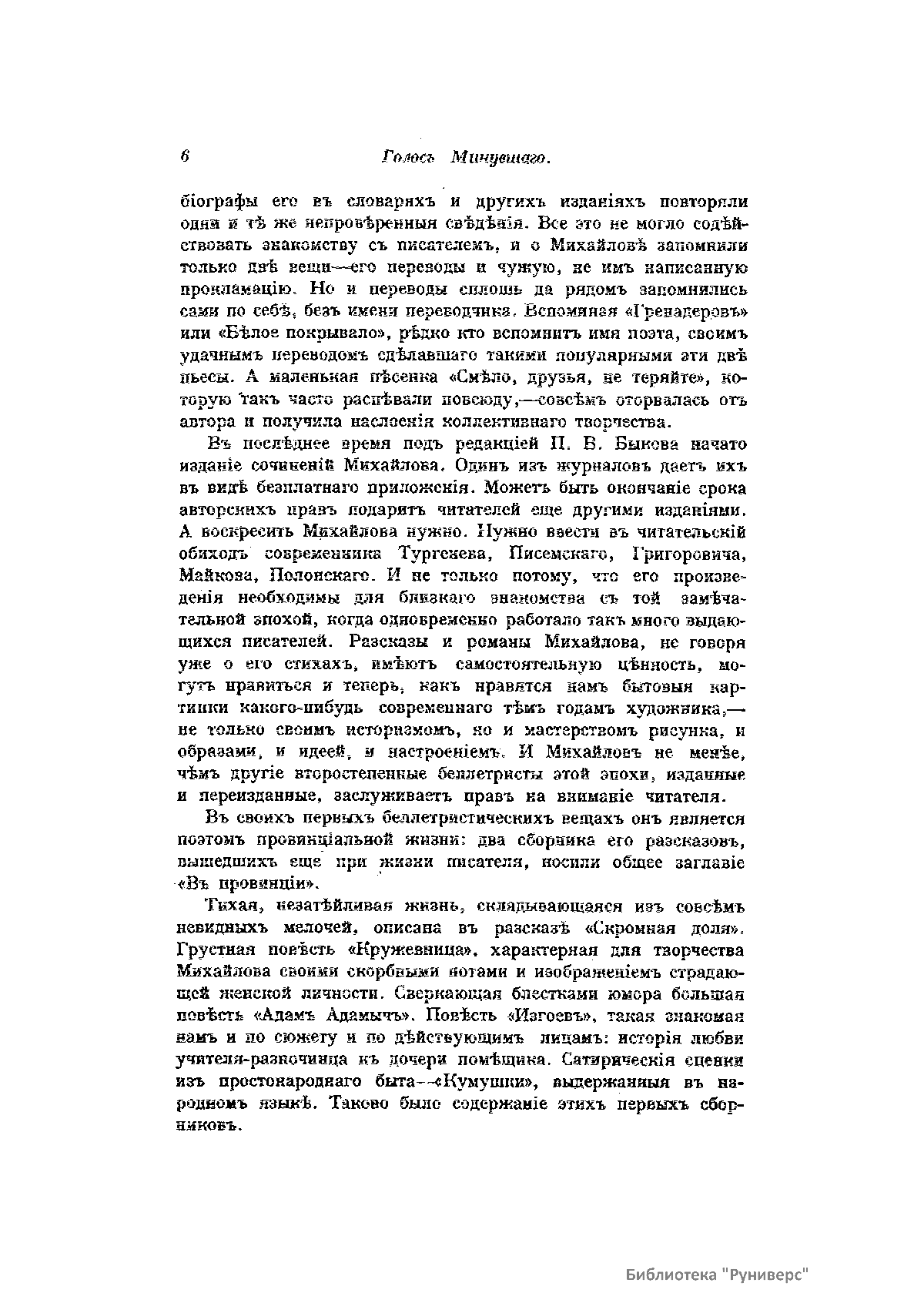 «Голос Минувшего» — журнал истории и истории литературы либерально-народнического направления, издававшийся в Москве с 1913 по 1923 год. Издателем журнала в 1913–1922 годах были известные русские историки, публицисты и общественные деятели С. П. Мельгунов (1880–1956) и В. И. Семевский (1848–1916). В редакционную коллегию также входили А. К. Дживелегов и П. Н. Сакулин. До 1919 «Голос минувшего» выходил ежемесячно, затем нерегулярно, всего было выпущено 65 номеров. В журнале публиковались интереснейшие материалы, посвященные истории литературы и общественных движений в России второй половины XVIII – начала XX веков. Здесь можно найти: статьи по вопросам русской и всеобщей истории, истории литературы, философии, искусства и археологии. В издании представлены: историческая беллетристика, биографии русских и иностранных деятелей, критика и библиография, новости русской и иностранной науки, обзор журналов русских и иностранных, хроника, мемуары, записки, дневники и письма декабристов, видных народовольцев и эсеров, крупных общественных деятелей и царских администраторов, писателей, военачальников и др. Среди авторов: Е. В. Тарле, А. Ф. Кони, А. К. Дживелегов, А. А. Кизеветтер, В. Г. Короленко и др. Стремление сделать журнал интересным для более широкого круга читателей способствовало тому, что в «Голосе Минувшего», хоть и в ограниченном количестве, печатались статьи по истории искусства и помещались иллюстрации: портреты, картины и рисунки, не знакомые или мало знакомые публике. В журнале опубликован целый ряд интересных писем, документов и воспоминаний. Абсолютное большинство текстов никогда не переиздавалось. Журнал снабжен указателями имен за 1913–1922 годы и систематическим указателем содержания.