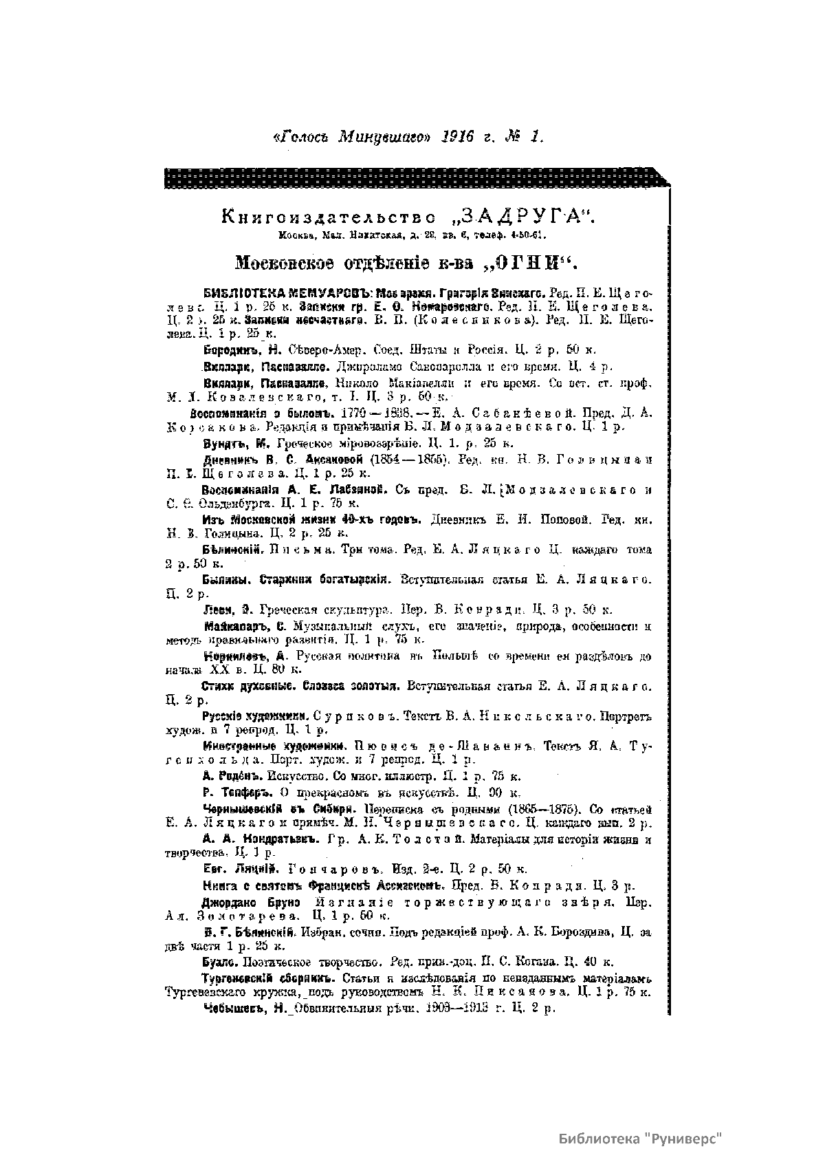 «Голос Минувшего» — журнал истории и истории литературы либерально-народнического направления, издававшийся в Москве с 1913 по 1923 год. Издателем журнала в 1913–1922 годах были известные русские историки, публицисты и общественные деятели С. П. Мельгунов (1880–1956) и В. И. Семевский (1848–1916). В редакционную коллегию также входили А. К. Дживелегов и П. Н. Сакулин. До 1919 «Голос минувшего» выходил ежемесячно, затем нерегулярно, всего было выпущено 65 номеров. В журнале публиковались интереснейшие материалы, посвященные истории литературы и общественных движений в России второй половины XVIII – начала XX веков. Здесь можно найти: статьи по вопросам русской и всеобщей истории, истории литературы, философии, искусства и археологии. В издании представлены: историческая беллетристика, биографии русских и иностранных деятелей, критика и библиография, новости русской и иностранной науки, обзор журналов русских и иностранных, хроника, мемуары, записки, дневники и письма декабристов, видных народовольцев и эсеров, крупных общественных деятелей и царских администраторов, писателей, военачальников и др. Среди авторов: Е. В. Тарле, А. Ф. Кони, А. К. Дживелегов, А. А. Кизеветтер, В. Г. Короленко и др. Стремление сделать журнал интересным для более широкого круга читателей способствовало тому, что в «Голосе Минувшего», хоть и в ограниченном количестве, печатались статьи по истории искусства и помещались иллюстрации: портреты, картины и рисунки, не знакомые или мало знакомые публике. В журнале опубликован целый ряд интересных писем, документов и воспоминаний. Абсолютное большинство текстов никогда не переиздавалось. Журнал снабжен указателями имен за 1913–1922 годы и систематическим указателем содержания.