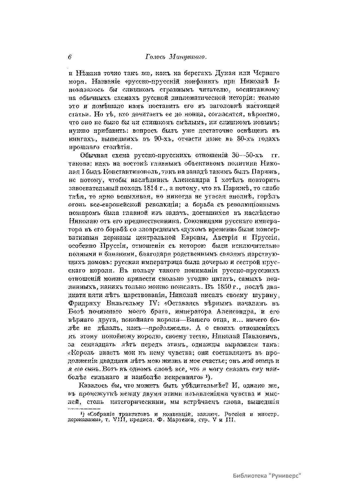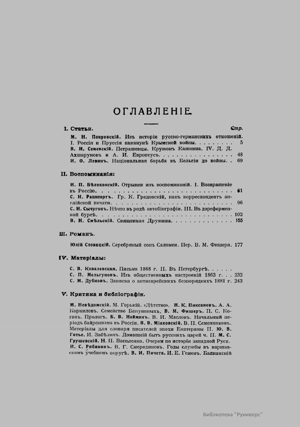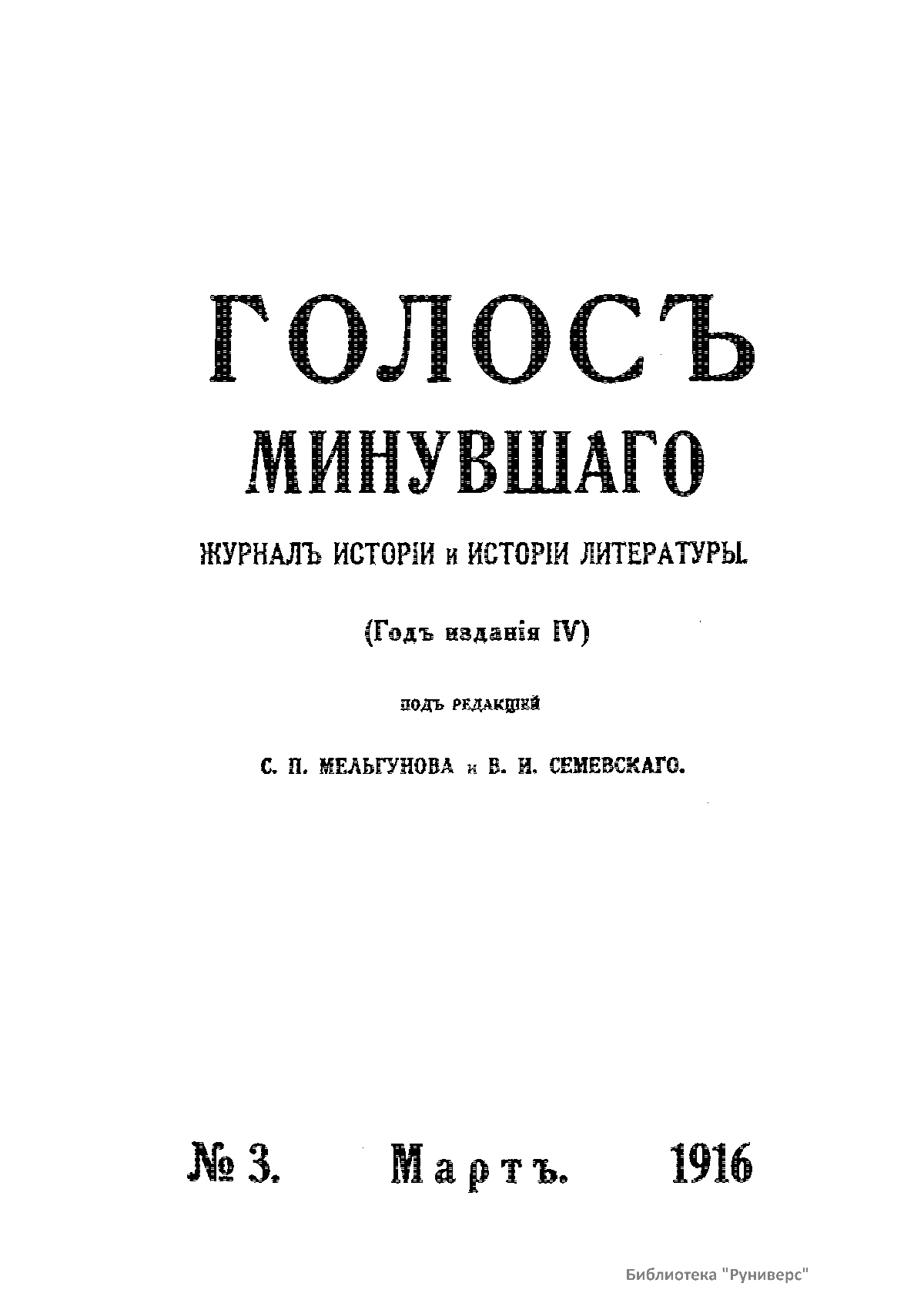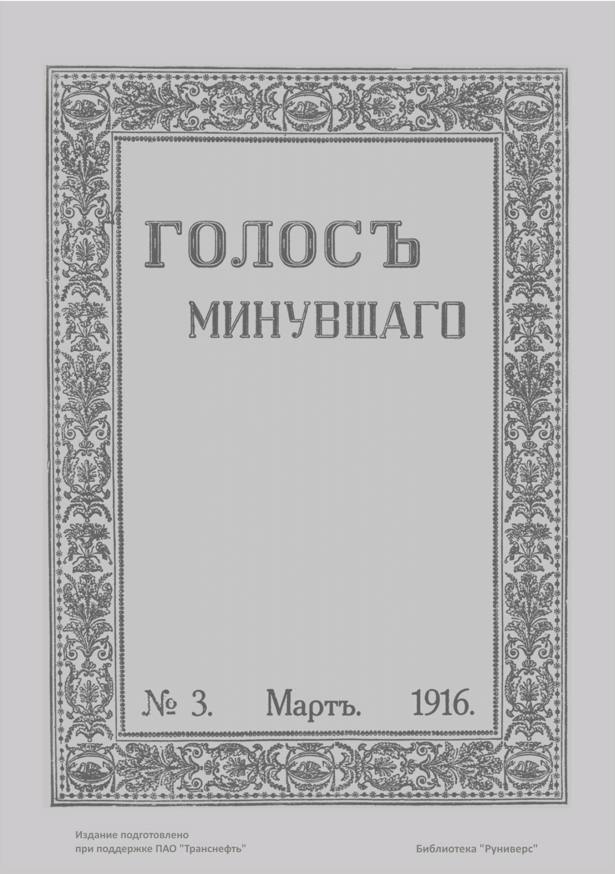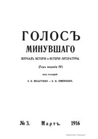 «Голос Минувшего» — журнал истории и истории литературы либерально-народнического направления, издававшийся в Москве с 1913 по 1923 год. Издателем журнала в 1913–1922 годах были известные русские историки, публицисты и общественные деятели С. П. Мельгунов (1880–1956) и В. И. Семевский (1848–1916). В редакционную коллегию также входили А. К. Дживелегов и П. Н. Сакулин. До 1919 «Голос минувшего» выходил ежемесячно, затем нерегулярно, всего было выпущено 65 номеров. В журнале публиковались интереснейшие материалы, посвященные истории литературы и общественных движений в России второй половины XVIII – начала XX веков. Здесь можно найти: статьи по вопросам русской и всеобщей истории, истории литературы, философии, искусства и археологии. В издании представлены: историческая беллетристика, биографии русских и иностранных деятелей, критика и библиография, новости русской и иностранной науки, обзор журналов русских и иностранных, хроника, мемуары, записки, дневники и письма декабристов, видных народовольцев и эсеров, крупных общественных деятелей и царских администраторов, писателей, военачальников и др. Среди авторов: Е. В. Тарле, А. Ф. Кони, А. К. Дживелегов, А. А. Кизеветтер, В. Г. Короленко и др. Стремление сделать журнал интересным для более широкого круга читателей способствовало тому, что в «Голосе Минувшего», хоть и в ограниченном количестве, печатались статьи по истории искусства и помещались иллюстрации: портреты, картины и рисунки, не знакомые или мало знакомые публике. В журнале опубликован целый ряд интересных писем, документов и воспоминаний. Абсолютное большинство текстов никогда не переиздавалось. Журнал снабжен указателями имен за 1913–1922 годы и систематическим указателем содержания.