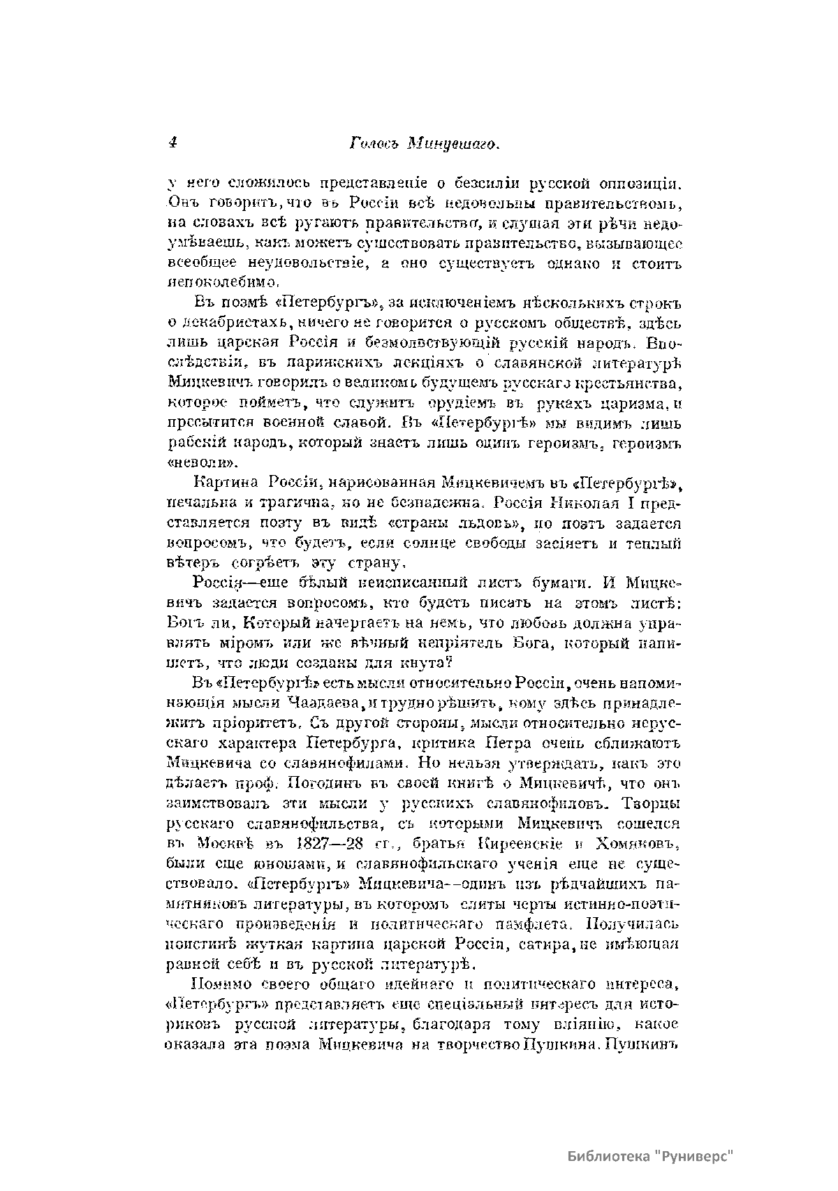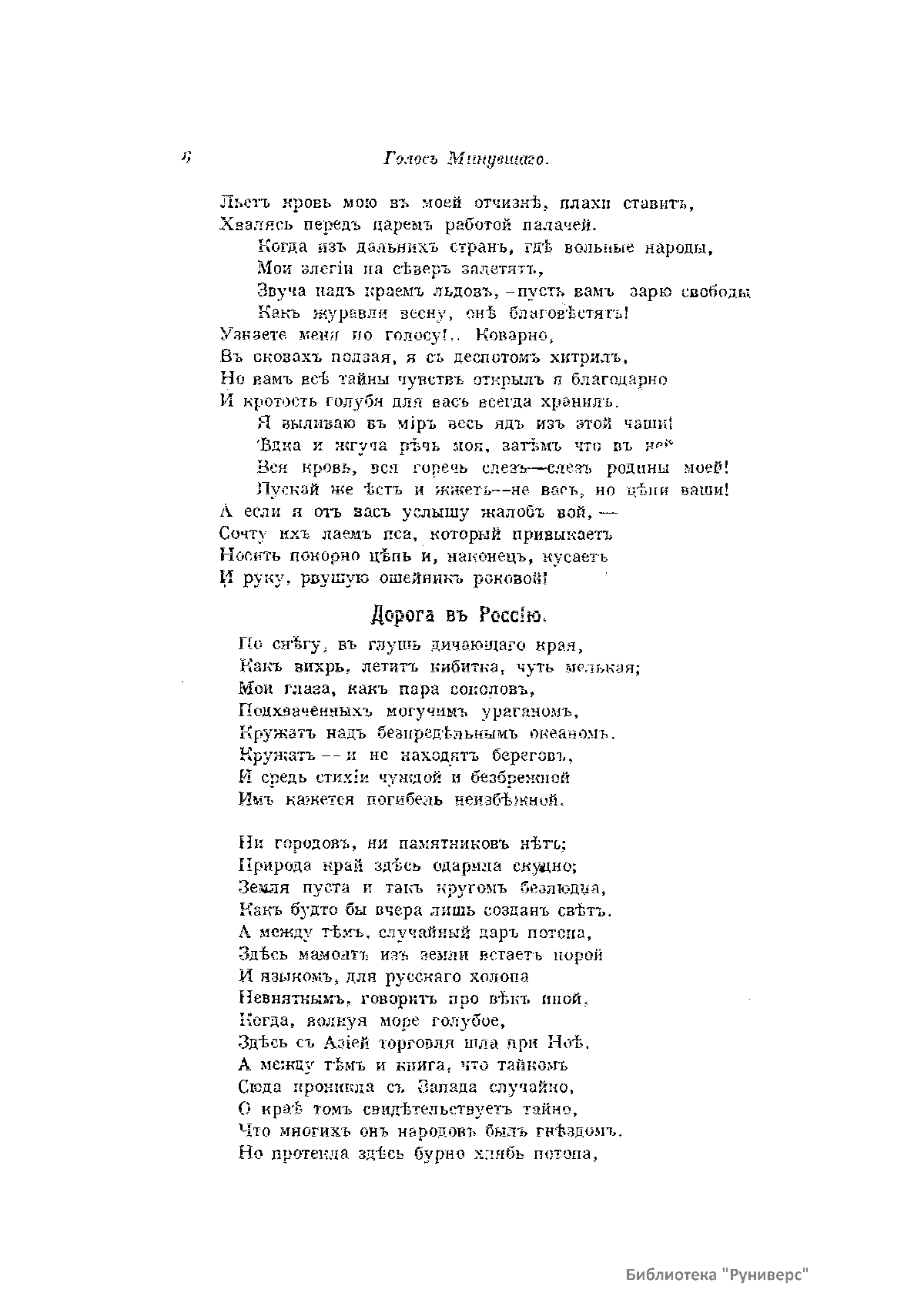 «Голос Минувшего» — журнал истории и истории литературы либерально-народнического направления, издававшийся в Москве с 1913 по 1923 год. Издателем журнала в 1913–1922 годах были известные русские историки, публицисты и общественные деятели С. П. Мельгунов (1880–1956) и В. И. Семевский (1848–1916). В редакционную коллегию также входили А. К. Дживелегов и П. Н. Сакулин. До 1919 «Голос минувшего» выходил ежемесячно, затем нерегулярно, всего было выпущено 65 номеров. В журнале публиковались интереснейшие материалы, посвященные истории литературы и общественных движений в России второй половины XVIII – начала XX веков. Здесь можно найти: статьи по вопросам русской и всеобщей истории, истории литературы, философии, искусства и археологии. В издании представлены: историческая беллетристика, биографии русских и иностранных деятелей, критика и библиография, новости русской и иностранной науки, обзор журналов русских и иностранных, хроника, мемуары, записки, дневники и письма декабристов, видных народовольцев и эсеров, крупных общественных деятелей и царских администраторов, писателей, военачальников и др. Среди авторов: Е. В. Тарле, А. Ф. Кони, А. К. Дживелегов, А. А. Кизеветтер, В. Г. Короленко и др. Стремление сделать журнал интересным для более широкого круга читателей способствовало тому, что в «Голосе Минувшего», хоть и в ограниченном количестве, печатались статьи по истории искусства и помещались иллюстрации: портреты, картины и рисунки, не знакомые или мало знакомые публике. В журнале опубликован целый ряд интересных писем, документов и воспоминаний. Абсолютное большинство текстов никогда не переиздавалось. Журнал снабжен указателями имен за 1913–1922 годы и систематическим указателем содержания.