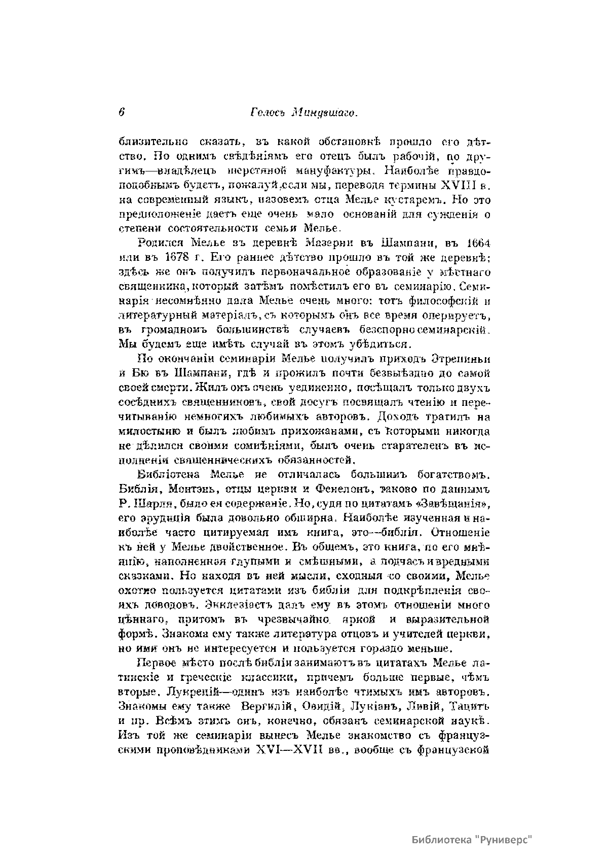 «Голос Минувшего» — журнал истории и истории литературы либерально-народнического направления, издававшийся в Москве с 1913 по 1923 год. Издателем журнала в 1913–1922 годах были известные русские историки, публицисты и общественные деятели С. П. Мельгунов (1880–1956) и В. И. Семевский (1848–1916). В редакционную коллегию также входили А. К. Дживелегов и П. Н. Сакулин. До 1919 «Голос минувшего» выходил ежемесячно, затем нерегулярно, всего было выпущено 65 номеров. В журнале публиковались интереснейшие материалы, посвященные истории литературы и общественных движений в России второй половины XVIII – начала XX веков. Здесь можно найти: статьи по вопросам русской и всеобщей истории, истории литературы, философии, искусства и археологии. В издании представлены: историческая беллетристика, биографии русских и иностранных деятелей, критика и библиография, новости русской и иностранной науки, обзор журналов русских и иностранных, хроника, мемуары, записки, дневники и письма декабристов, видных народовольцев и эсеров, крупных общественных деятелей и царских администраторов, писателей, военачальников и др. Среди авторов: Е. В. Тарле, А. Ф. Кони, А. К. Дживелегов, А. А. Кизеветтер, В. Г. Короленко и др. Стремление сделать журнал интересным для более широкого круга читателей способствовало тому, что в «Голосе Минувшего», хоть и в ограниченном количестве, печатались статьи по истории искусства и помещались иллюстрации: портреты, картины и рисунки, не знакомые или мало знакомые публике. В журнале опубликован целый ряд интересных писем, документов и воспоминаний. Абсолютное большинство текстов никогда не переиздавалось. Журнал снабжен указателями имен за 1913–1922 годы и систематическим указателем содержания.