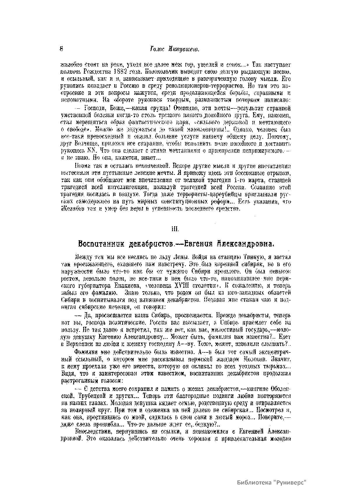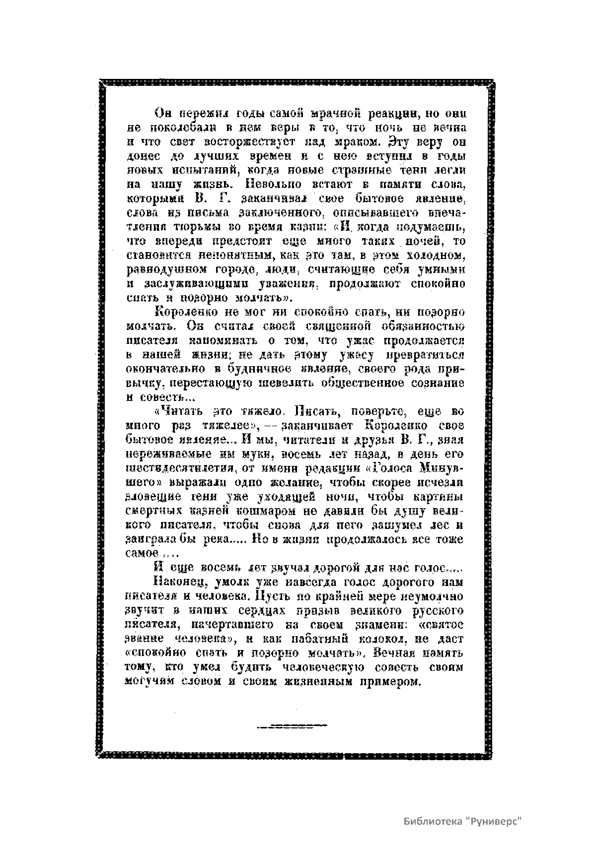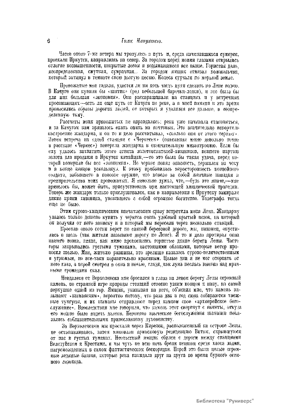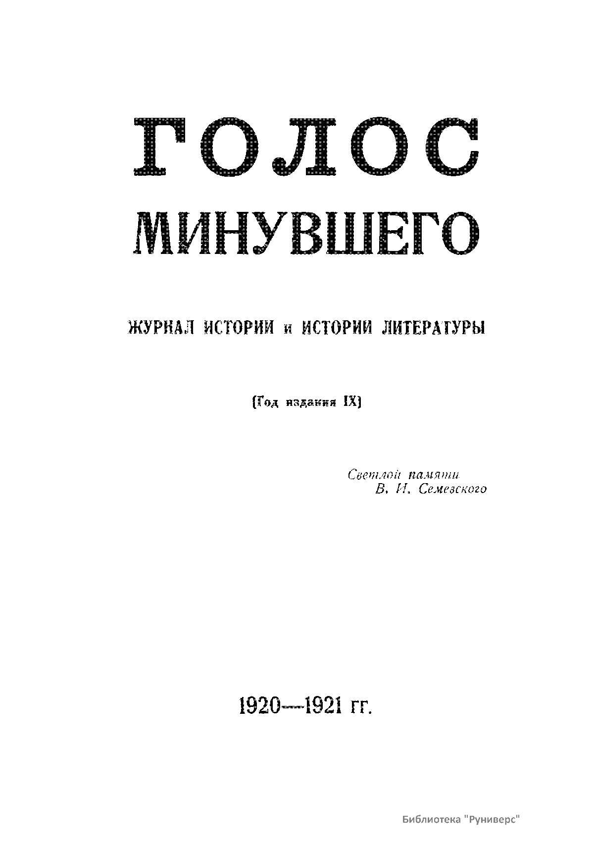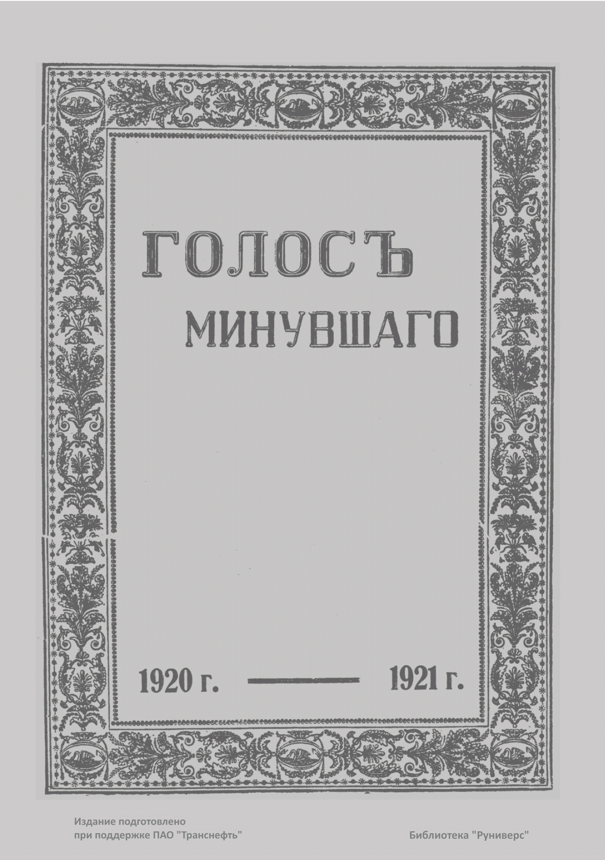 «Голос Минувшего» — журнал истории и истории литературы либерально-народнического направления, издававшийся в Москве с 1913 по 1923 год. Издателем журнала в 1913–1922 годах были известные русские историки, публицисты и общественные деятели С. П. Мельгунов (1880–1956) и В. И. Семевский (1848–1916). В редакционную коллегию также входили А. К. Дживелегов и П. Н. Сакулин. До 1919 «Голос минувшего» выходил ежемесячно, затем нерегулярно, всего было выпущено 65 номеров. В журнале публиковались интереснейшие материалы, посвященные истории литературы и общественных движений в России второй половины XVIII – начала XX веков. Здесь можно найти: статьи по вопросам русской и всеобщей истории, истории литературы, философии, искусства и археологии. В издании представлены: историческая беллетристика, биографии русских и иностранных деятелей, критика и библиография, новости русской и иностранной науки, обзор журналов русских и иностранных, хроника, мемуары, записки, дневники и письма декабристов, видных народовольцев и эсеров, крупных общественных деятелей и царских администраторов, писателей, военачальников и др. Среди авторов: Е. В. Тарле, А. Ф. Кони, А. К. Дживелегов, А. А. Кизеветтер, В. Г. Короленко и др. Стремление сделать журнал интересным для более широкого круга читателей способствовало тому, что в «Голосе Минувшего», хоть и в ограниченном количестве, печатались статьи по истории искусства и помещались иллюстрации: портреты, картины и рисунки, не знакомые или мало знакомые публике. В журнале опубликован целый ряд интересных писем, документов и воспоминаний. Абсолютное большинство текстов никогда не переиздавалось. Журнал снабжен указателями имен за 1913–1922 годы и систематическим указателем содержания.