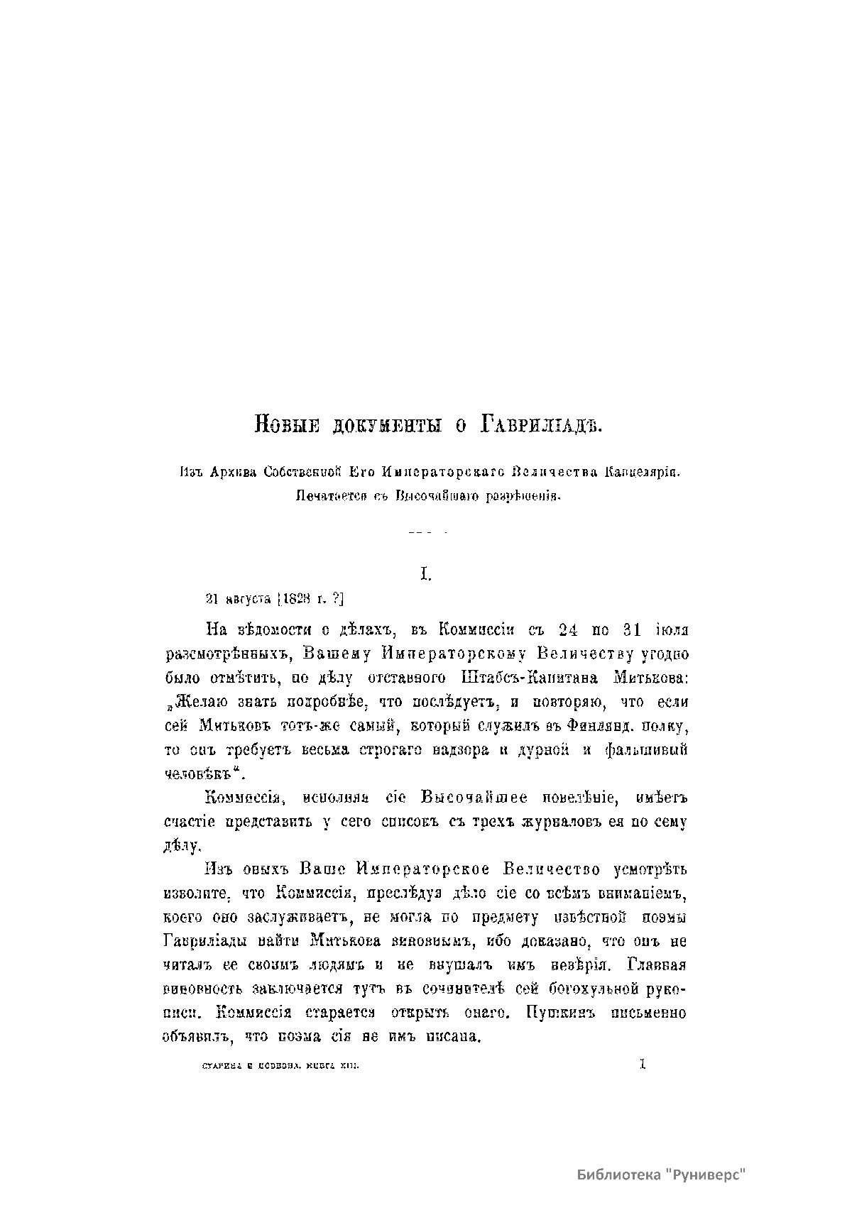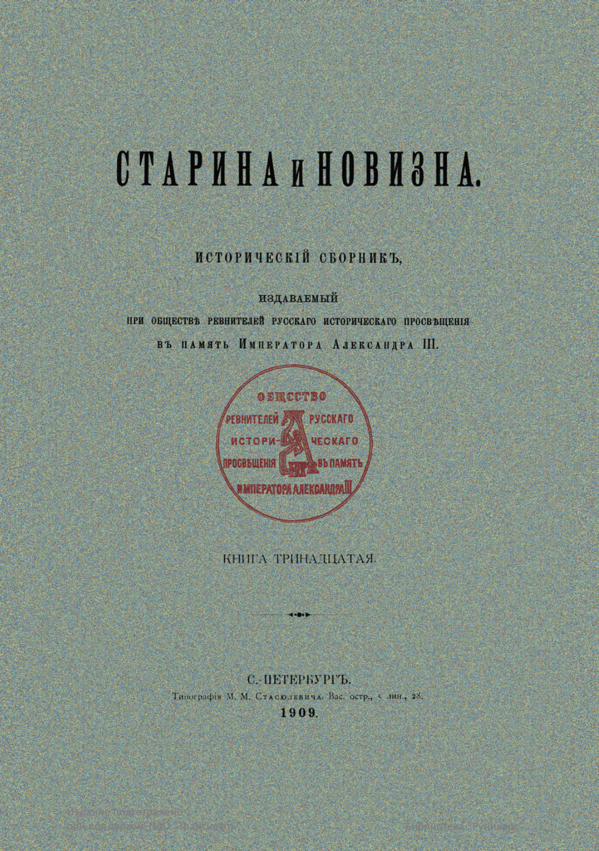 «Старина и новизна» — русский исторический сборник, издававшийся «Обществом ревнителей русского исторического просвещения в память императора Александра III». Сборник выходил в Петербурге в 1897–1904 и в Москве в 1904–1917 годах по мере накопления материала. Руководил изданием сборника граф С. Д. Шереметев (1844–1918) — историк, археолог, председатель «Общества», одного из первых объединений историков монархического направления. Члены общества способствовали изданию документов прошлого, содействуя развитию исторической науки и популяризации интереса к историческим материалам. «Старина и новизна» представляет собой собрание документальных материалов по русской истории и литературе XVII–XIX века. Вместе с Шереметевым в создании сборника участвовали блестящие историки А. П. и Н. П. Барсуковы, С. Ф. Платонов, Л. П. Майков и др.