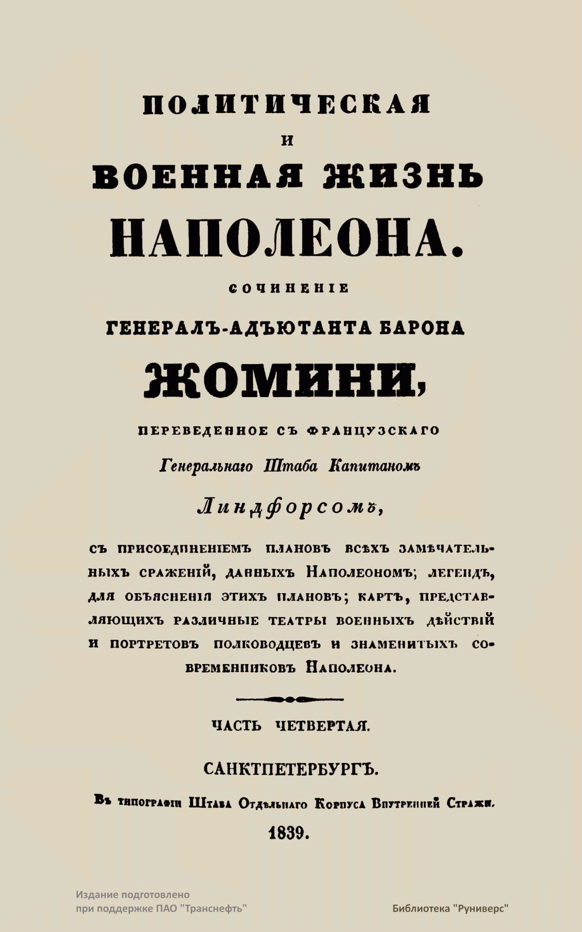Русский перевод сочинения «Политическая и военная жизнь Наполеона» был сделан со знаменитой работы Жомини, изданной в Париже в 1827 г., — «Vie politique et militaire de Napoléon, racontée par lui-même au tribunal de César, d’Alexandre et de Frédéric» («Политическая и военная жизнь Наполеона, рассказанная им перед судом Цезаря, Александра и Фридриха»). Для данного труда Жомини избрал форму рассказа, который Наполеон ведет о своих походах. В основу этого повествования от первого лица лег, без сомнения, труд Э. О. де Лас Каза — секретаря Наполеона, записывавшего его мысли и воспоминания на острове Св. Елены, изданный в 1822–1823 гг. под названием «Mémorial de Sainte-Hélène» («Мемориал Святой Елены).
