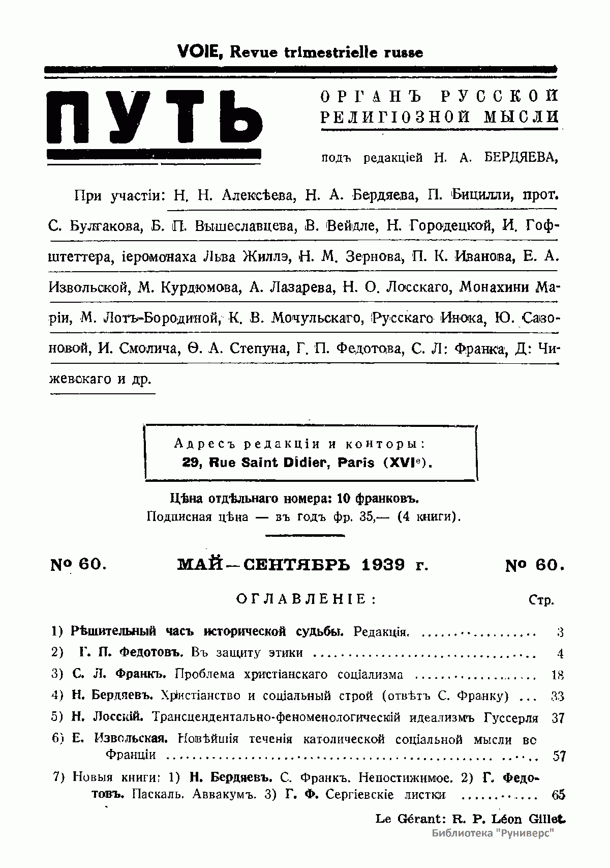Путь: Орган русской религиозной мысли. №60. Май-Сентябрь 1939
