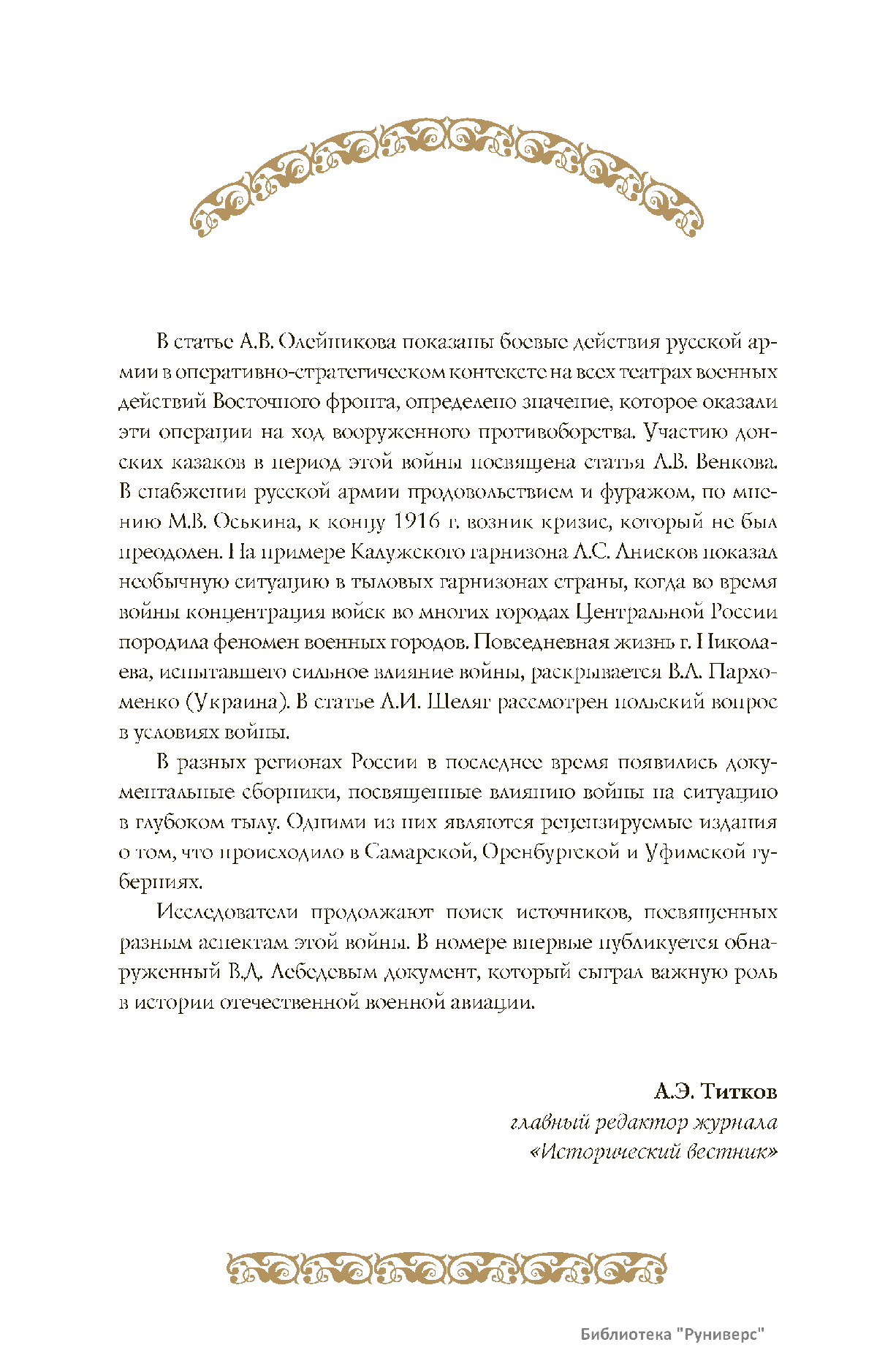 Дорогие коллеги, мы представляем вам первый номер «Исторического вестника», который одновременно обозначается 148-м томом, тем самым продолжая дореволюционное издание. Однако, перешагивая почти сто лет, мы понимаем, что реалии XXI века определяют и новое содержание журнала. История сегодня во многом актуализирована политикой. Именно геополитическая ситуация в мире, возвращающая нас к вопросам сохранения существующих границ, национальных и культурных ценностей, моральных и религиозных принципов, формирует еще одно измерение — проблему аутентичного исторического бытования народов и государств. С одной стороны, это вопрос географических ареалов государственных образований, с другой — тема, связанная с соприкосновением, взаимодействием процессов, культур и традиций. Во многом мы стоим и перед важнейшей этической проблемой. Мы должны не только вежливо и настойчиво указывать нашим уважаемым соседям на свои исторические права, но и сами уходить от искушения искусственного удревнения собственной истории или присвоения чужой. И здесь на сцену выходит его величество Исторический Научный Факт. Он и есть главный цензор и законодатель. На этом незыблемом основании будет строиться редакционная и научная работа «Исторического вестника».