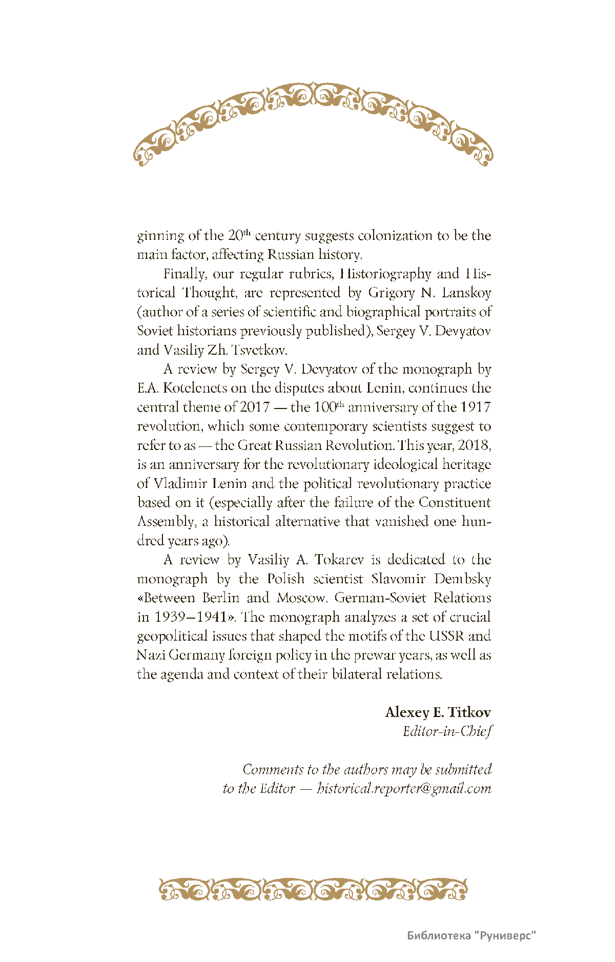 Дорогие коллеги, мы представляем вам первый номер «Исторического вестника», который одновременно обозначается 148-м томом, тем самым продолжая дореволюционное издание. Однако, перешагивая почти сто лет, мы понимаем, что реалии XXI века определяют и новое содержание журнала. История сегодня во многом актуализирована политикой. Именно геополитическая ситуация в мире, возвращающая нас к вопросам сохранения существующих границ, национальных и культурных ценностей, моральных и религиозных принципов, формирует еще одно измерение — проблему аутентичного исторического бытования народов и государств. С одной стороны, это вопрос географических ареалов государственных образований, с другой — тема, связанная с соприкосновением, взаимодействием процессов, культур и традиций. Во многом мы стоим и перед важнейшей этической проблемой. Мы должны не только вежливо и настойчиво указывать нашим уважаемым соседям на свои исторические права, но и сами уходить от искушения искусственного удревнения собственной истории или присвоения чужой. И здесь на сцену выходит его величество Исторический Научный Факт. Он и есть главный цензор и законодатель. На этом незыблемом основании будет строиться редакционная и научная работа «Исторического вестника».