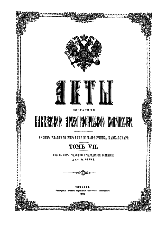 Документы по истории Кавказа с X века по 1862 год издавались по инициативе русских властей под редакцией председателя Кавказской археографической комиссии Адольфа Петровича Берже (1828 – 1886). В двенадцати томах издания опубликованы разнообразные сведения по истории народов Кавказа: арабская хроника, фирманы, гуджары (жалованные грамоты) и другие акты, главным образом XIV — первой половины XIX века на грузинском, армянском, русском, арабском, персидском, татарском, турецком языках с русским переводом, а также родословные местных ханов и султанов. Каждый том включает документы за время правления того или иного кавказского наместника.