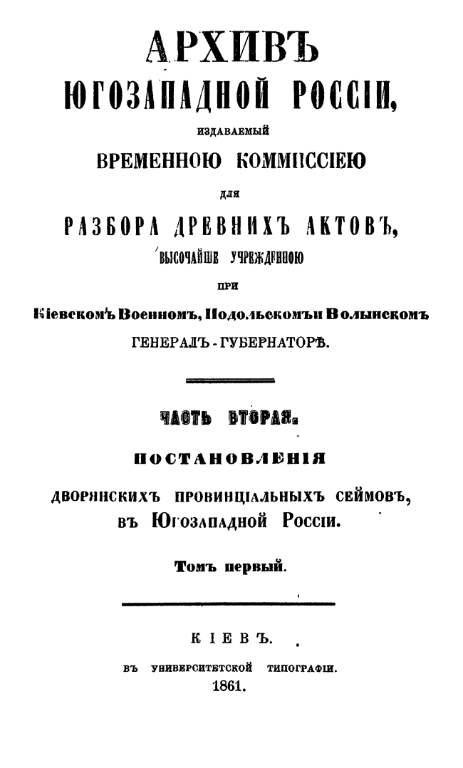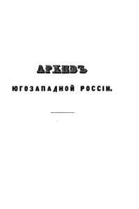 В серии «Архив Юго-Западной России» были напечатаны документы Киевского архива. Издание было предпринято Киевской археографической комиссией с 1859 по 1911 год. Всего вышло 34 тома.