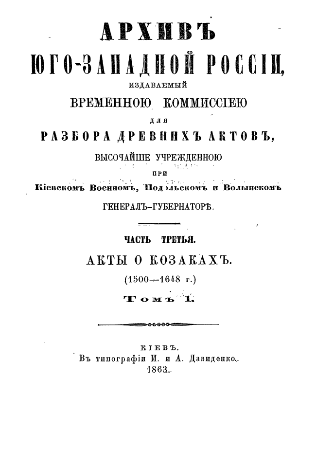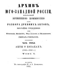 В серии «Архив Юго-Западной России» были напечатаны документы Киевского архива. Издание было предпринято Киевской археографической комиссией с 1859 по 1911 год. Всего вышло 34 тома.