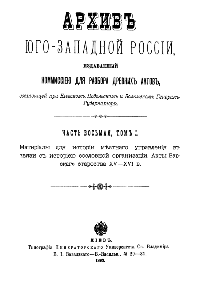 В серии «Архив Юго-Западной России» были напечатаны документы Киевского архива. Издание было предпринято Киевской археографической комиссией с 1859 по 1911 год. Всего вышло 34 тома.