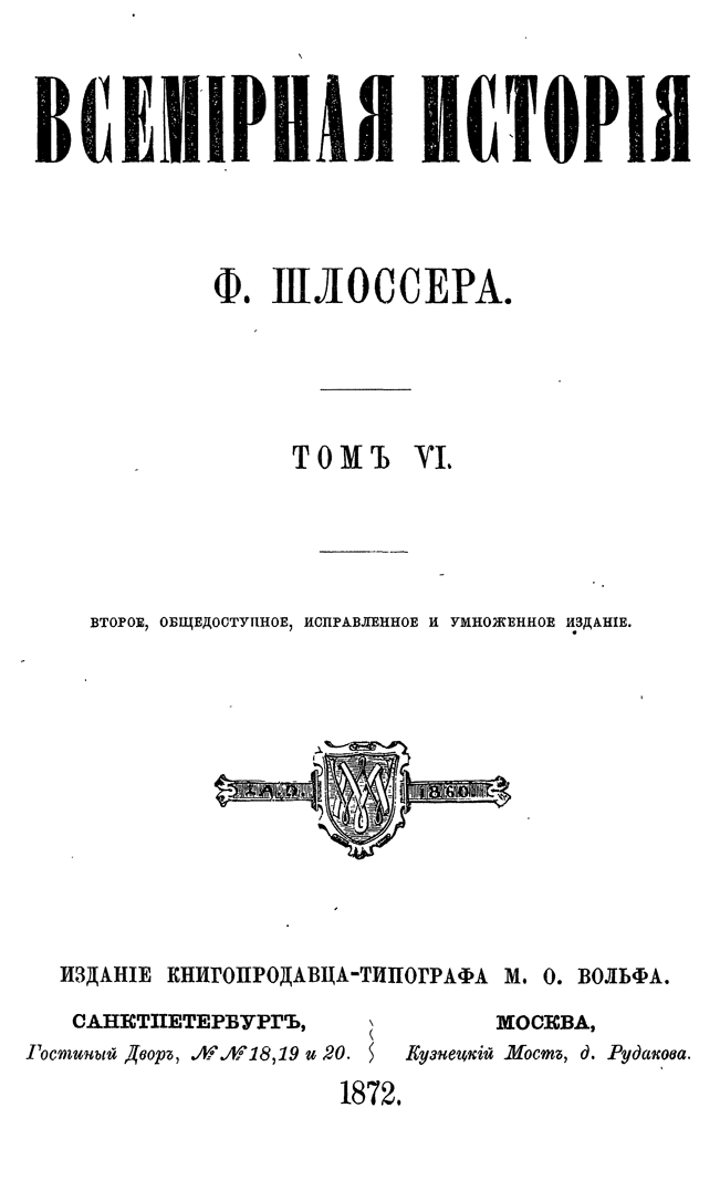 «Всемирная история» — знаменитый фундаментальный труд немецкого ученого Фридриха Кристофа Шлоссера представляет собой синтез его специальных исследований и университетских курсов. Описываемый период доведен до 1815 года.