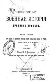 Впервые издана в Петербурге в 1872-1878 гг. Свой капитальный труд «Всеобщая военная история» в 15 томах князь Николай Сергеевич Голицын создал в 1838-47 годах в период профессорско-преподавательской работы в Императорской военной академии, где он руководил кафедрой стратегии и затем — военной истории. На протяжении двадцати лет со времени учреждения академии не существовало учебного пособия на русском языке по военной истории. Голицын, с разрешения академического и высшего начальства, делает первый шаг к восполнению недостатка в военной литературе. Работа Голицына явилась первой в России и Европе попыткой полного систематического изложения всеобщей военной истории и задумывалась автором как руководство к преподаванию и изучению этого предмета.