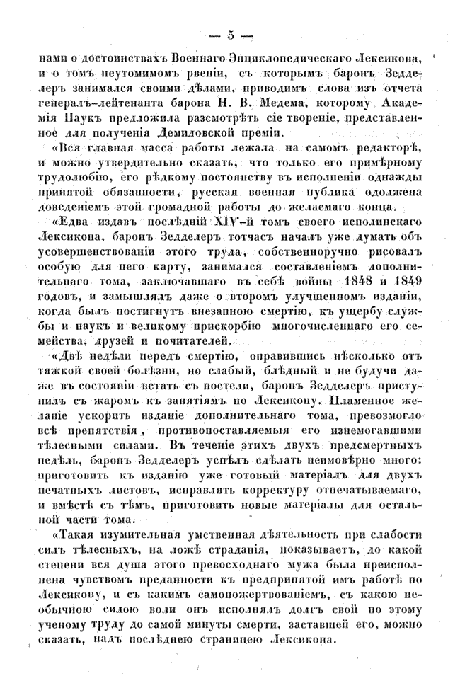 Военный энциклопедический лексикон впервые издавался с 1837 по 1850 год и насчитывает 14 основных томов и один дополнительный (вышел в 1852 г.). Этот огромный труд обязан своим появлением почти исключительно энергии и настойчивости его редактора барона Л. И. Зедделера, на котором лежала вся основная масса работы. По сути своей «Лексикон» являлся первой  русской военной энциклопедией (до него выходил только двухтомный «Военный словарь» С. А. Тучкова,  в 1818 г.). Несмотря на довольно холодный приём военными кругами первых выпусков «Лексикона», выходившего небольшими книжками (известно, что первая часть состояла из четырёх отдельных книжек) через значительные промежутки времени и стоившего в продаже весьма немалых денег, Зедделер настойчиво занимался его изданием, вложив, помимо личного труда, и значительную часть своего состояния, и в течение 13 лет привёл его к окончанию. Программа «Лексикона» была намечена чрезвычайно широко, имея в виду крайне низкий образовательный уровень армейского офицерства времён императора Николая I и трудность пополнения общего образования при глухих стоянках и постоянном передвижении полков с места на место. В силу этого в «Лексикон» включён ряд сведений, весьма отдалённо связанных с военным делом. Барону Зедделеру удалось привлечь к составлению «Лексикона» наиболее выдающихся военных и учёных Николаевского времени, среди которых особо выделяются К. Ф. Багговут, М. И. Богданович, К. М. Базили, А. В. Висковатов, Н. С. Голицын, А. Н. Греч, Д. А. Милютин, А. И. Михайловский-Данилевский, П. И. Рикорд и другие. Из отделов «Лексикона» наиболее полным и наиболее тщательно составленным является военно-исторический отдел; слабее всего выглядит отдел военной техники, что вполне соответствует тогдашнему её состоянию. «Лексикон» построен по алфавиту статей; к некоторым томам сделано особое «Прибавление», включающее в себя некоторые статьи, пропущенные по разным причинам в предыдущих томах. В связи с долгим изданием «Лексикона» и достаточно быстрым устареванием имеющихся в нём сведений, в 1852 г. был выпущен дополнительный том под названием «Прибавление к Военному энциклопедическому лексикону».