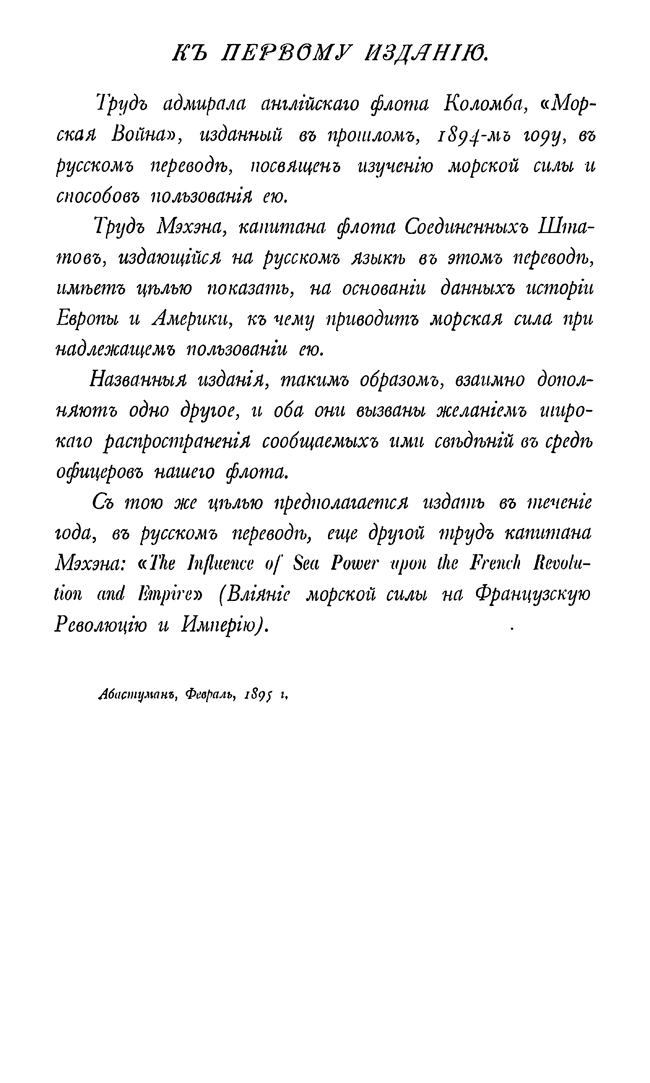 Целью настоящего труда служит исследование общей истории Европы и Америки, специально со стороны влияния морской силы на ход этой истории. и показать её первостепенное значение. Мэхен поставил перед собой важную задачу выявить точные факторы этого влияния и сформулировать их.