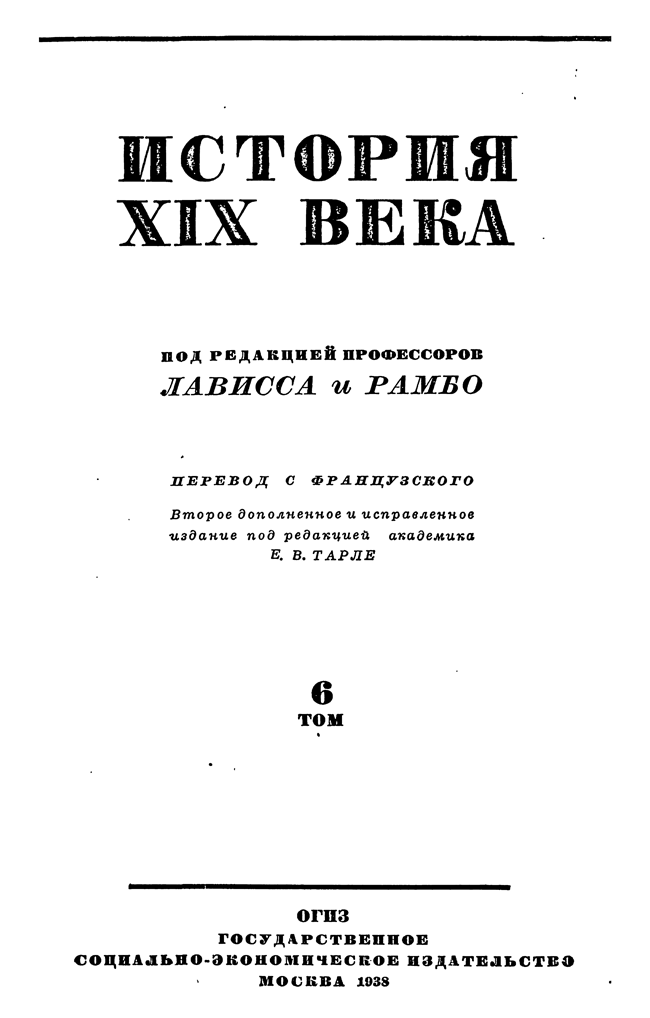 «История XIX века», впервые опубликованная на русском языке в 1906 году, составляет последнюю часть из двенадцатитомной «Всеобщей истории с IV столетия до нашего времени» (1893-1901). Общий план этого большого издания был выработан редакторами, а отдельные главы писали различные специалисты.