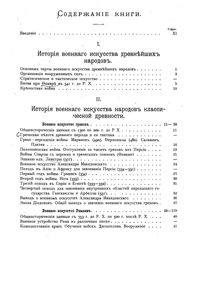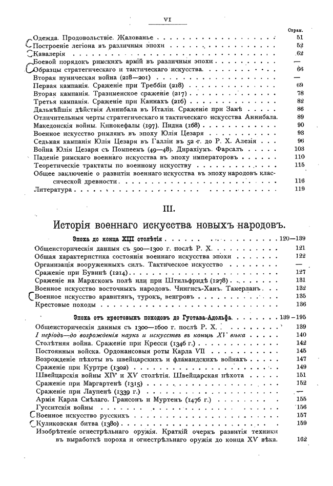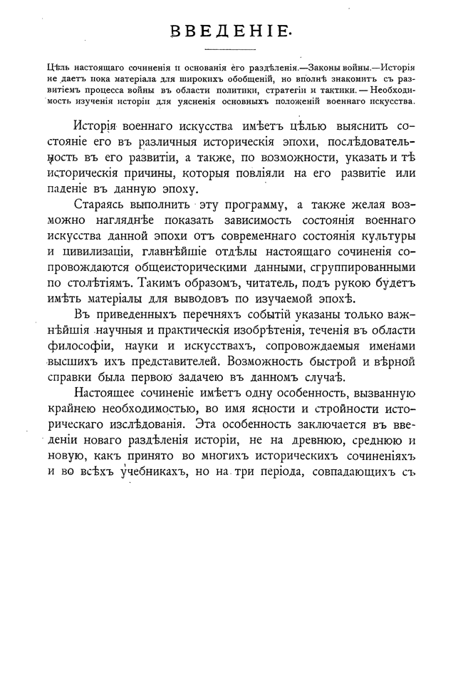 Стараясь выполнить эту программу, а также желая возможно нагляднее показать зависимость состояния военного искусства данной эпохи от современного состояния культуры и цивилизации, главные отделы настоящего сочинения сопровождаются общеисторическими данными, сгруппированными по столетиям. В приведенных перечнях событий указаны только важнейшие научные и практические изобретения, течения в области философии, науки и искусства.