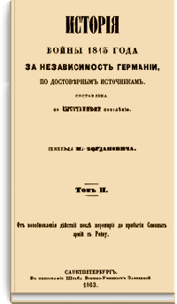 «История войны 1813 года за независимость Германии» есть продолжение составленной Богдановичем «Истории Отечественной войны 1812 года». Основной мыслью сего труда было желание представить верную картину одной из важнейших эпох не только русской, но и всемирной истории.