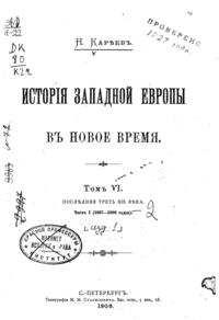 Первые тома вышли в начале девяностых годов 19 века и, посвященные- один «переходу от средних веков к новому времени», другой — «реформации и политической жизни в XVI и XVII вв.», третий — «XVIII веку и революции», — возникли из читанных им общих курсов новой истории, имевших своей целью выяснить значение двух главных переворотов в жизни европейского Запада за последние четыре века, т.е., реформации и революции — в связи с общим характером новой истории с её отличием от средневековой. Однако, позднее, Кареев решился раздвинуть границы первых задач и довести повествание до современнго ему положения дел.