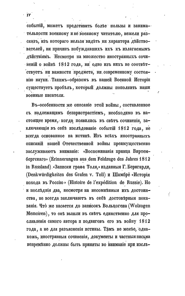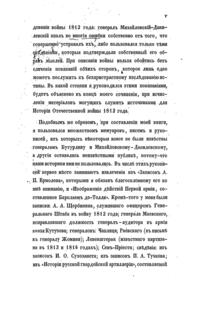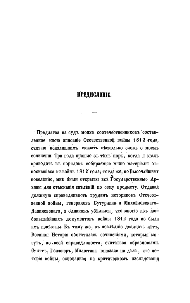 Автор считает своей обязанностью, с одной стороны, начертать высокий образ монарха, уверенного в вещественных и нравственных силах русского народа и одержавшего ценой неимоверных трудов и пожертвований верх над гениальным противником, с другой – представить картину грозного нашествия на Россию армии, составленной почти из всех европейских наций, и борьбы с ней русского народа. Автор специально указывает на то, что в своих выводах, основанных на критическом исследовании событий, он руководствовался беспристрастным отношением и к своим, и к неприятелю.