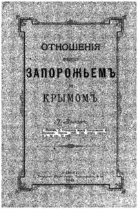 В книге «Отношенiя между Запорожьемъ и Крымомъ» повествуются об отношениях между Запорожьем и Крымом после татарского нашествия, факторах сближения (политических, экономических), также изложены с комметариями известия, сохранившиеся об этих отношениях.
