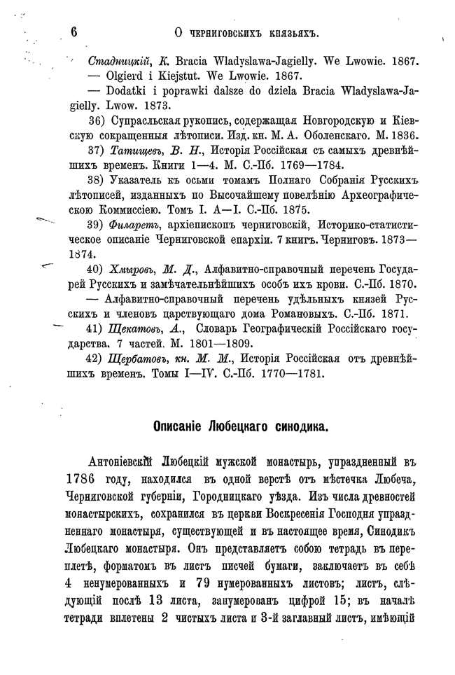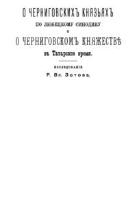 Автор, используя любецкий поминальный синодик, содержащий имена черниговских князей, попытался восстановить в отдельных деталях историю Черниговского княжества в период ига. Он откомментировал имена персон, упомянутых в синодике и сопоставил сведения о них с материалами, собранными Археографической комиссией.