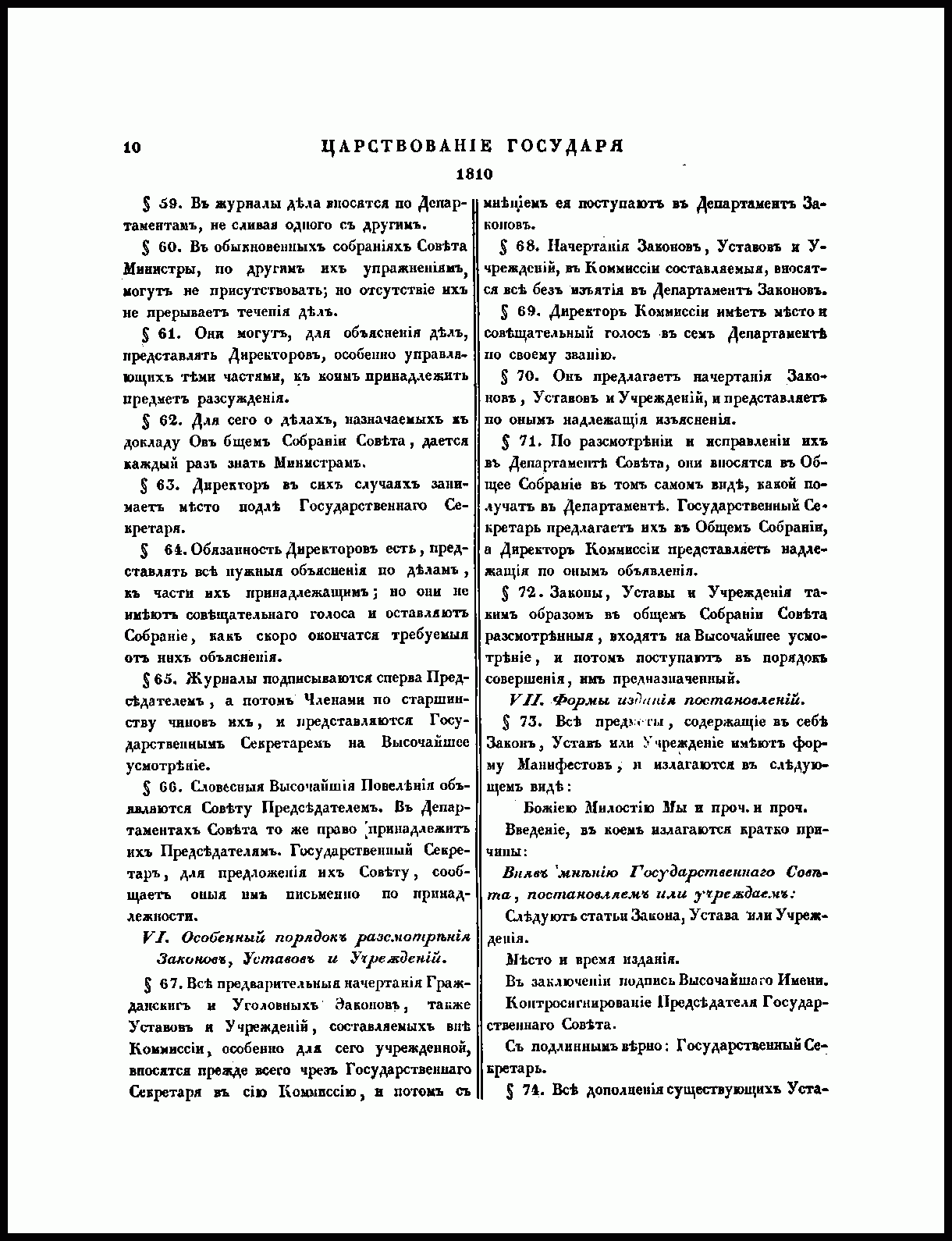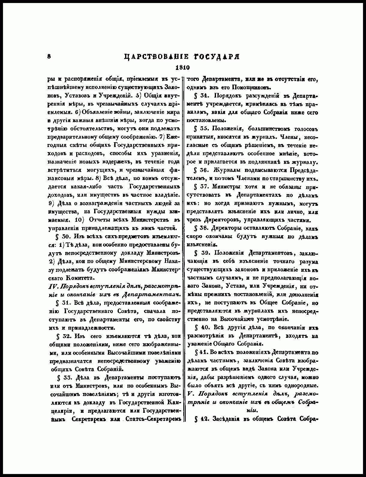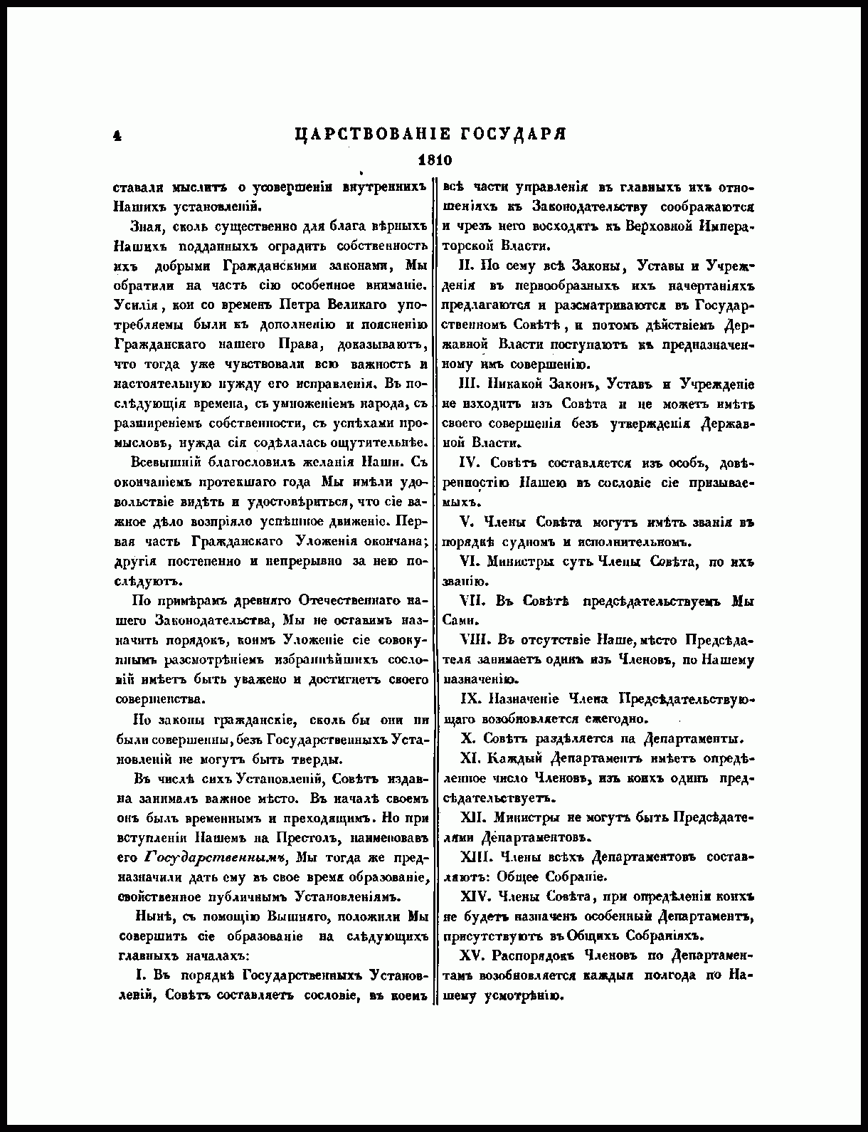 Первое издание 1830 г., составленное под руководством М. М. Сперанского, включает более 30 тысяч законодательных актов с 1649 по 1825 г (45 томов) — время правления Алексея Михайловича — Александра I (33 тома).