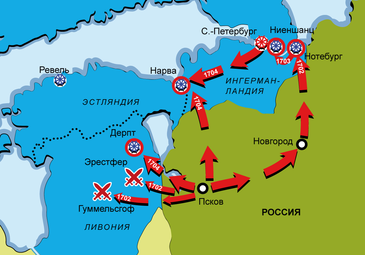 Северная война 1700-1721. Карта кампаний 1701–1704 гг. Действия в Ингерманландии и Ливонии