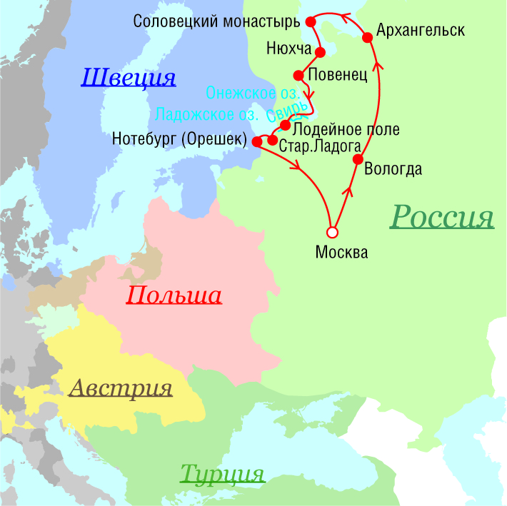 На карте указаны маршруты путешествий Петра I на каждый год. Расстояния приблизительно вычислены по российским дорожникам XVIII и XIX вв. Различия в длине маршрутов Петра и современного пути объясняются другой сеткой дорог. Длина маршрутов, на которые данные дорожников отсутствуют, была определена по электронным картам.