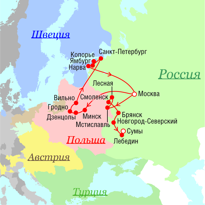 Маршруты поездок Петра I