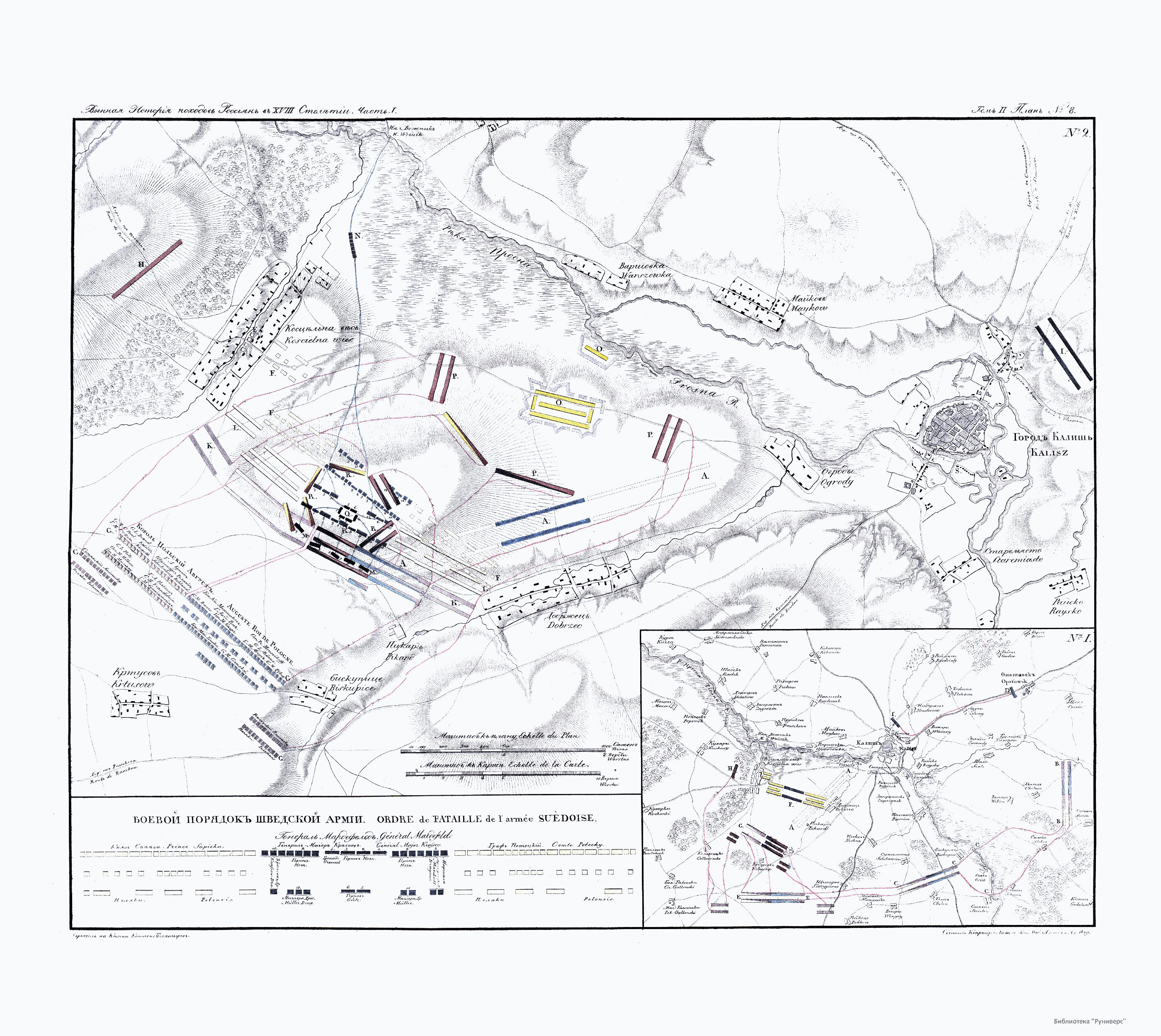 План сражения при Калише между корпусом союзных Российских и Саксонских войск под предводительством Польского короля Августа и шведскими войсками под начальством генерала Мардефельда 18 октября 1706 года