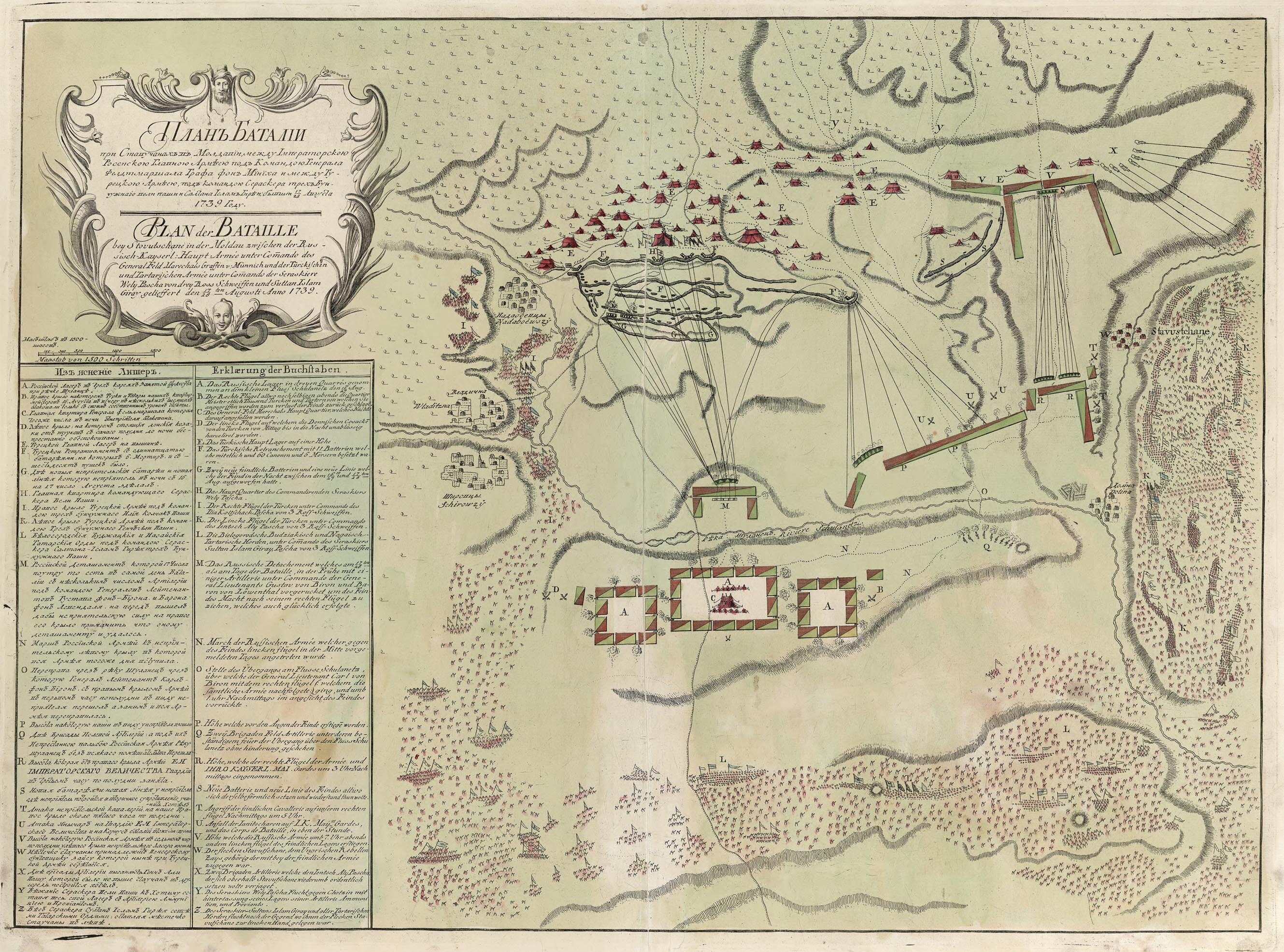 План баталии при Ставучанах в Молдавии между императорскою Российскою главною армиею под командою генерала фелдмаршала фон-Миниха и между Турецкою армиею под командою сераскера трехбунчужного Вели-паши и султана Ислам Гирея, бывшей 17/28 августа 1739 году