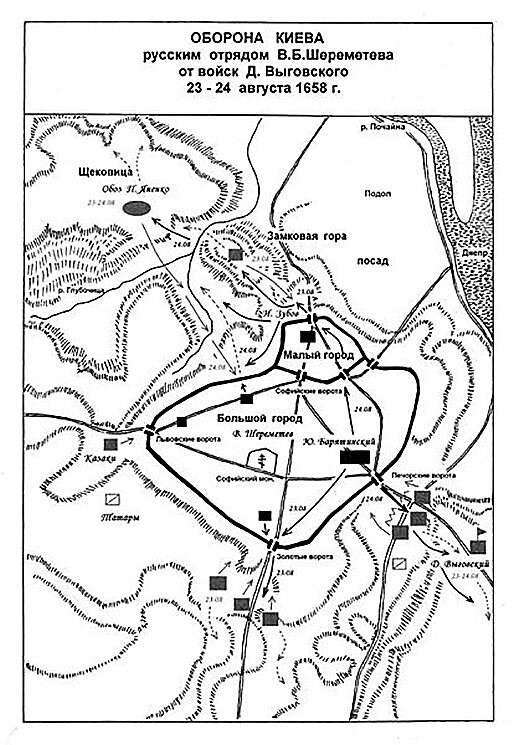 Карта: Оборона Киева русским отрядом В.Б. Шереметева от войск Д. Выговского 23 — 24 августа 1658 г.