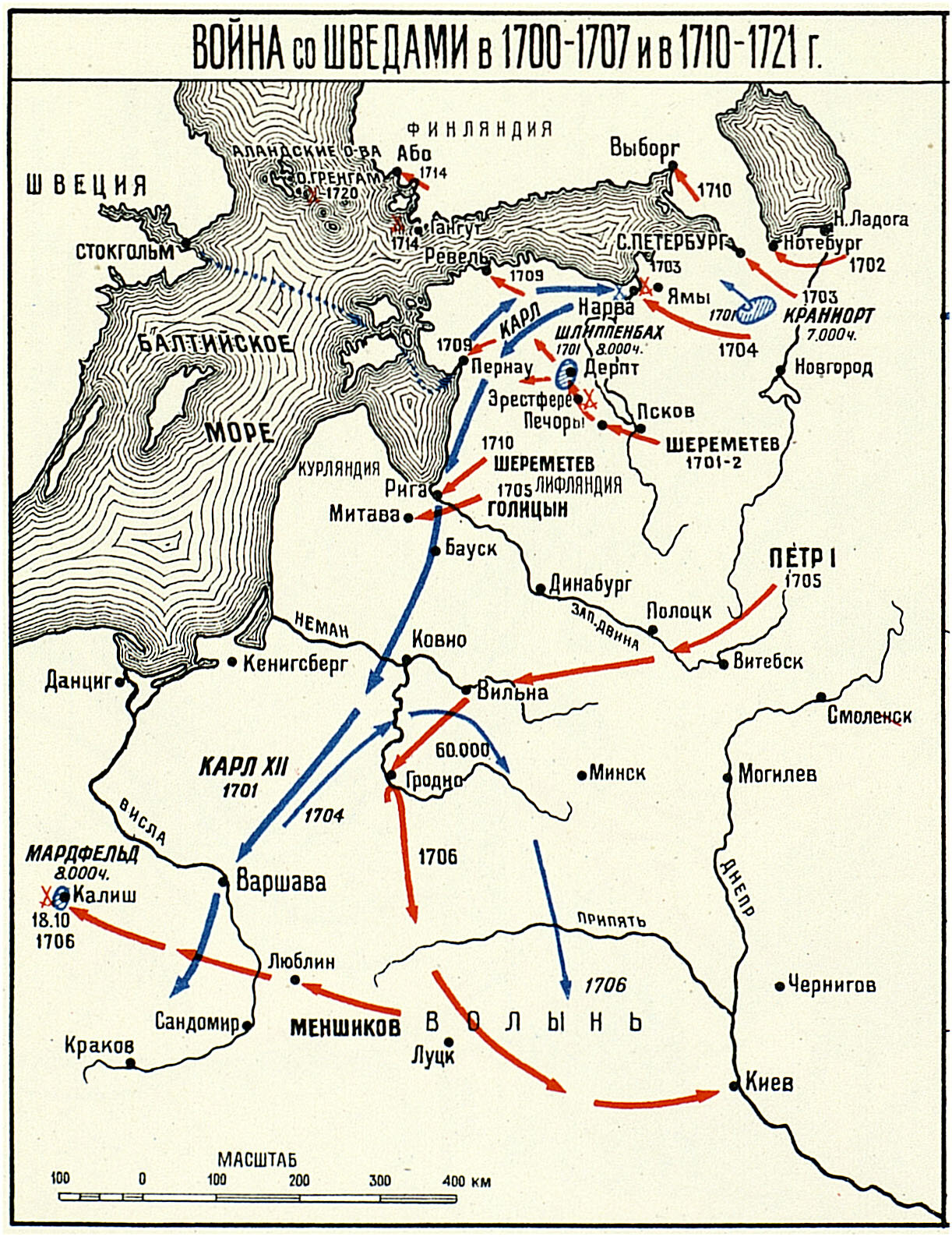 Карта: Война со шведами в 1700-1707 и в 1710-1721 гг