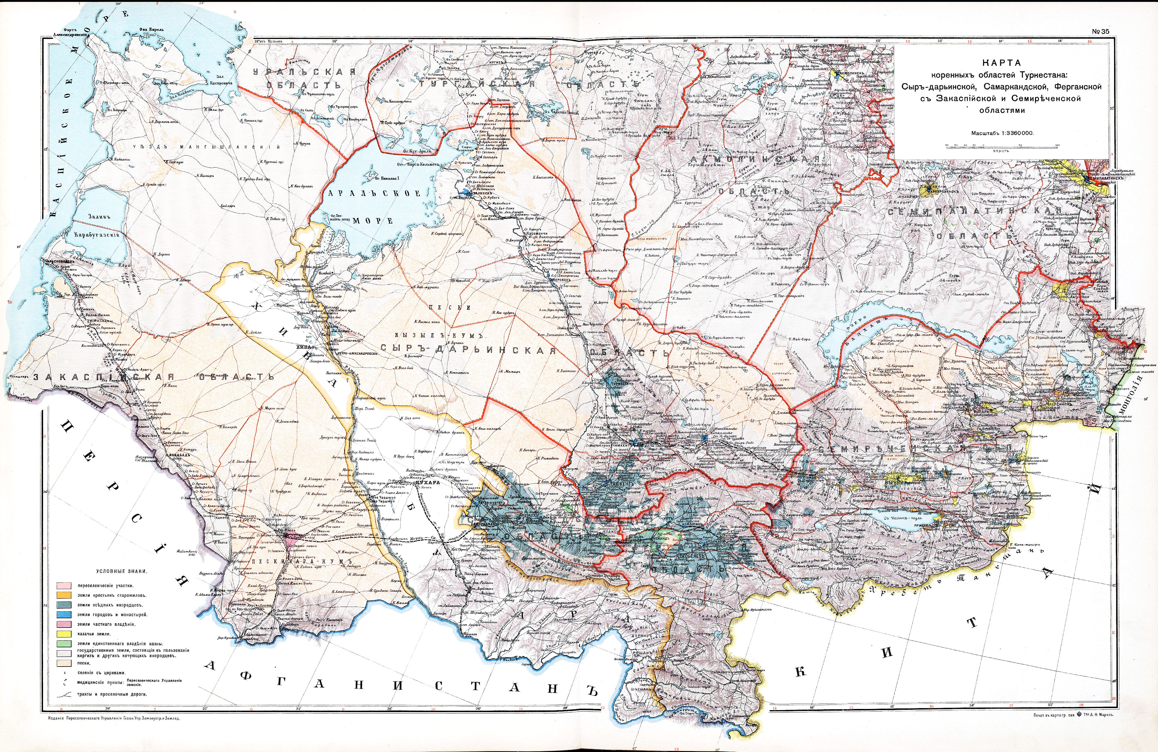Карта коренных областей Туркестана: Сыр-Дарьинской, Самаркандской, Ферганской с Закаспийской и Семиреченской областями