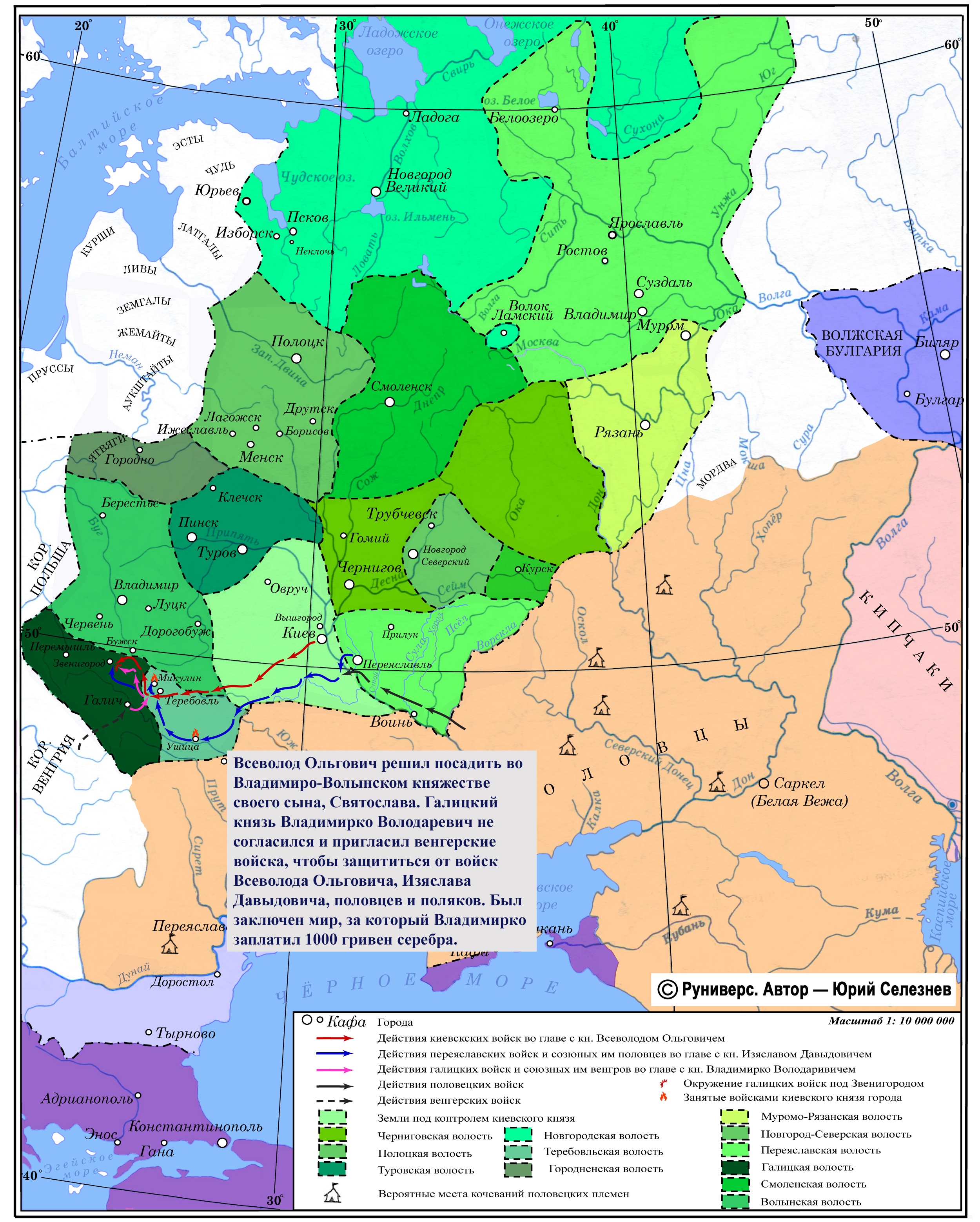 Всеволод Ольгович решил посадить во Владимиро-Волынском княжестве своего сына, Святослава. Галицкий князь Владимирко Володаревич не согласился и пригласил венгерские войска, чтобы защититься от войск Всеволода Ольговича, Изяслава Давыдовича, половцев и поляков. Был заключен мир, за который Владимирко заплатил 1000 гривен серебра.