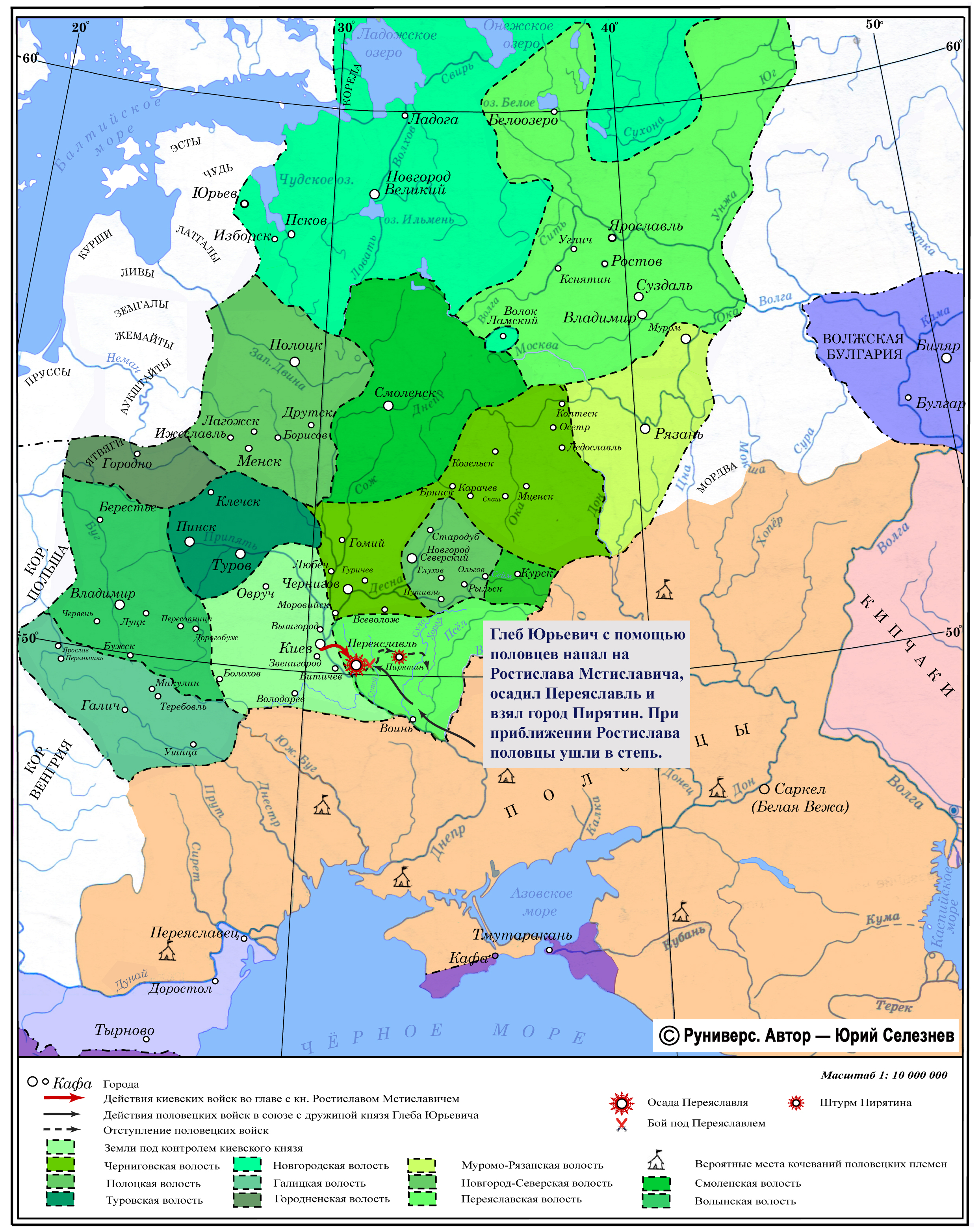 Глеб Юрьевич с помощью половцев напал на Ростислава Мстиславича, осадил Переяславль и взял город Пирятин. При приближении Ростислава половцы ушли в степь.