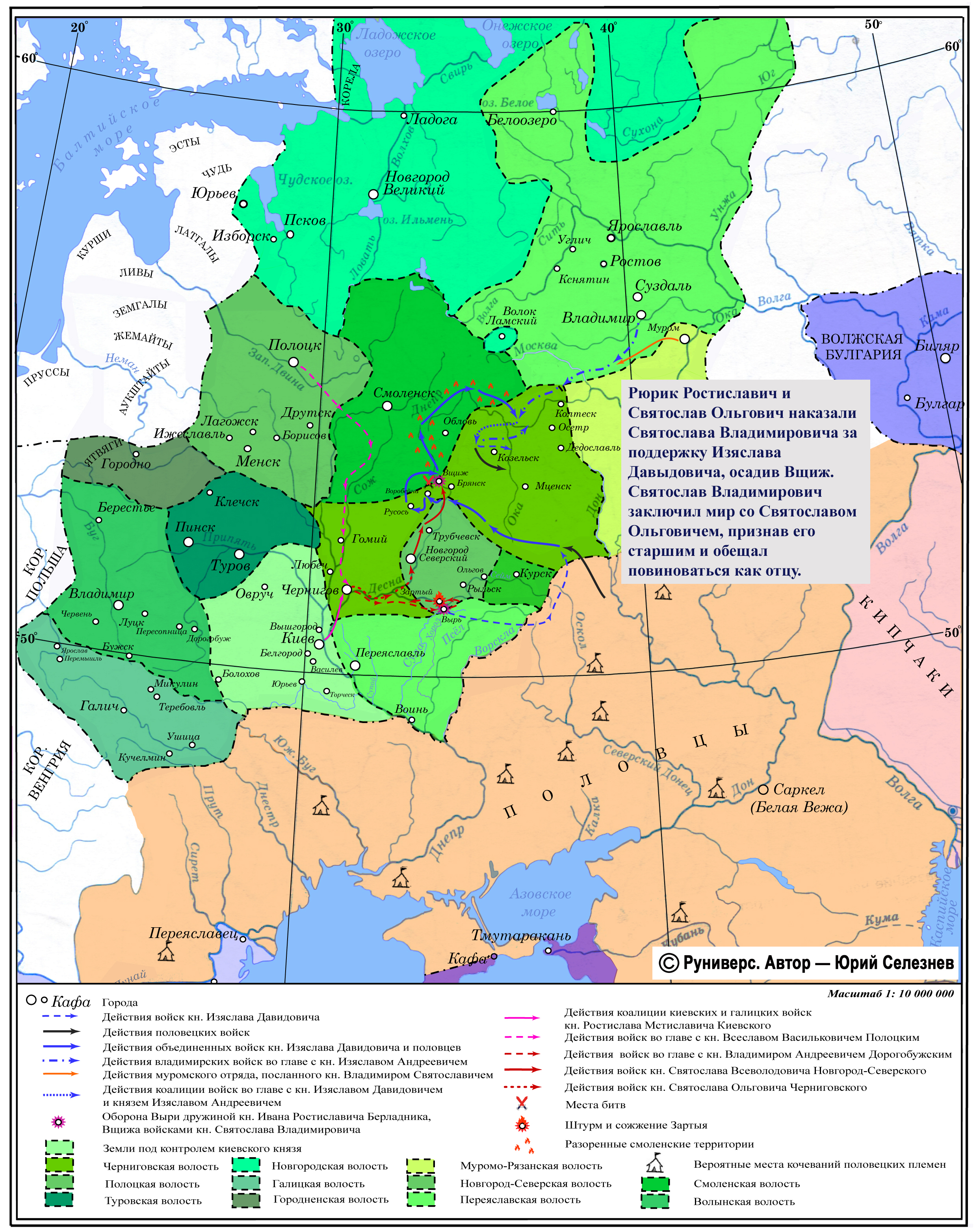 Рюрик Ростиславич и Святослав Ольгович наказали Святослава Владимировича за поддержку Изяслава Давыдовича, осадив Вщиж. Святослав Владимирович заключил мир со Святославом Ольговичем, признав его старшим и обещал повиноваться как отцу.