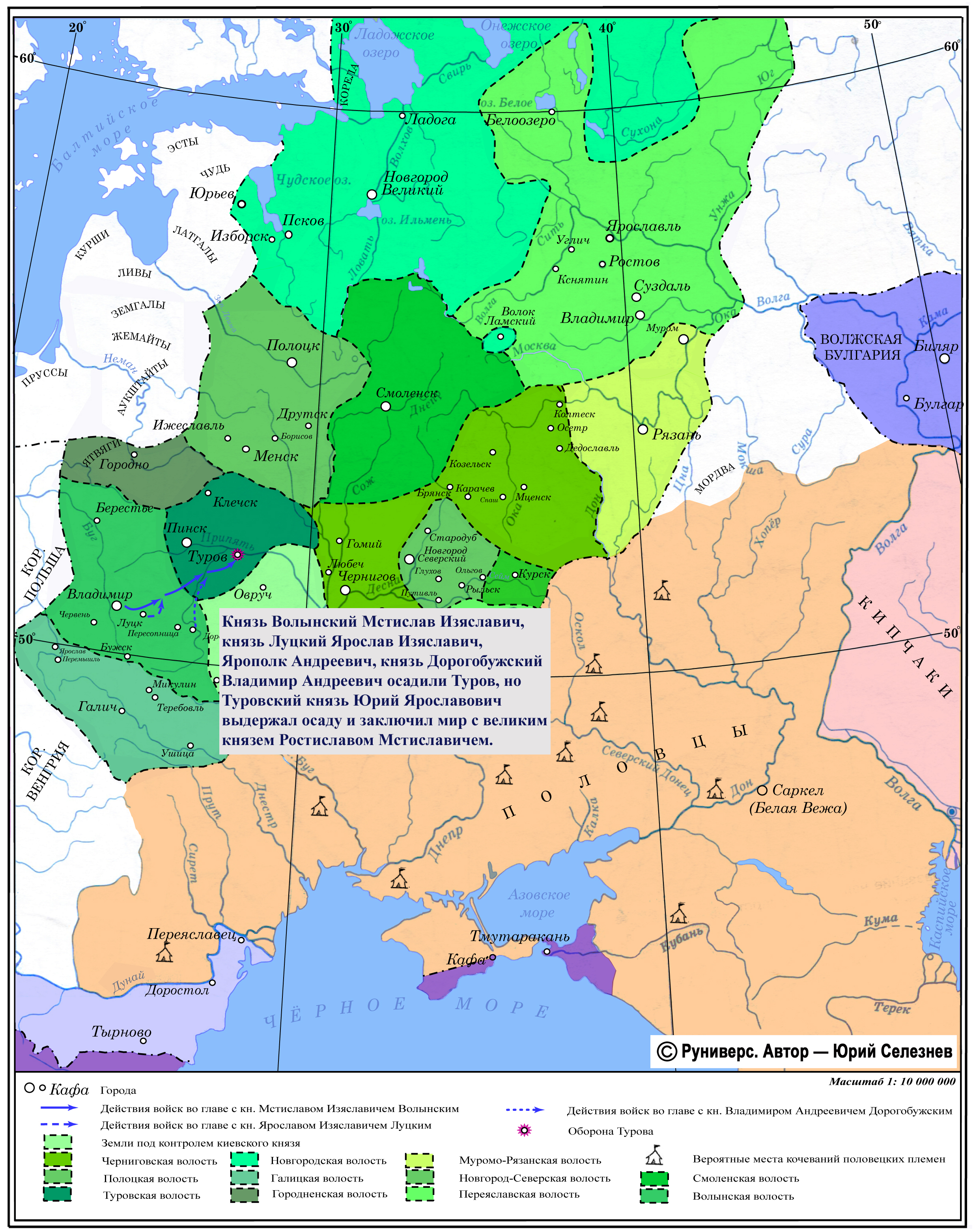 Князь Волынский Мстислав Изяславич, князь Луцкий Ярослав Изяславич, Ярополк Андреевич, князь Дорогобужский Владимир Андреевич осадили Туров, но Туровский князь Юрий Ярославович выдержал осаду и заключил мир с великим князем Ростиславом Мстиславичем.