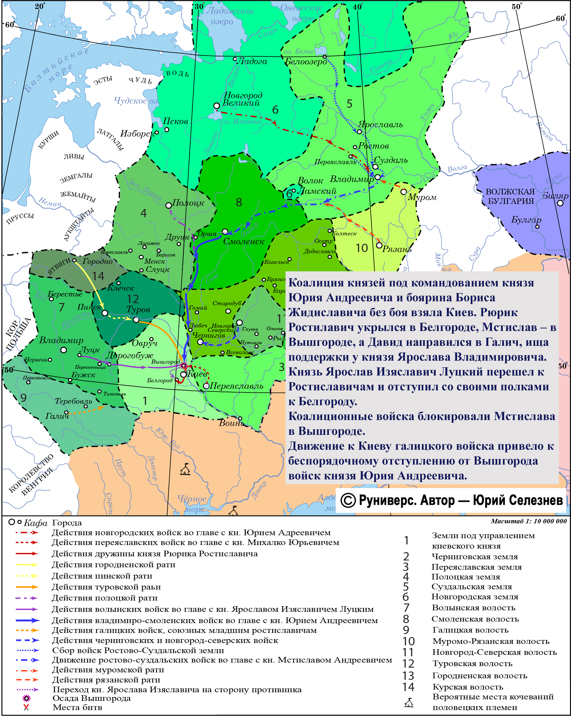 Суздальский князь Андрей Юрьевич в ответ на выдавливание Ростиславичами из Южной Руси его родственников в конце 1173 г. собрал войска и направил их к Киеву. Кроме его сыновей и братьев в коалицию вошли муромские и рязанские князья, князь Роман Ростиславич Смоленский, присоединились к армии Святослав Всеволодович Черниговский, Игорь Святославич Новгород-Северский, Ярослав Изяславич, новгородские полки, берендеи. Общее командование было возложено на князя Юрия Андреевича и боярина Бориса Жидиславича.