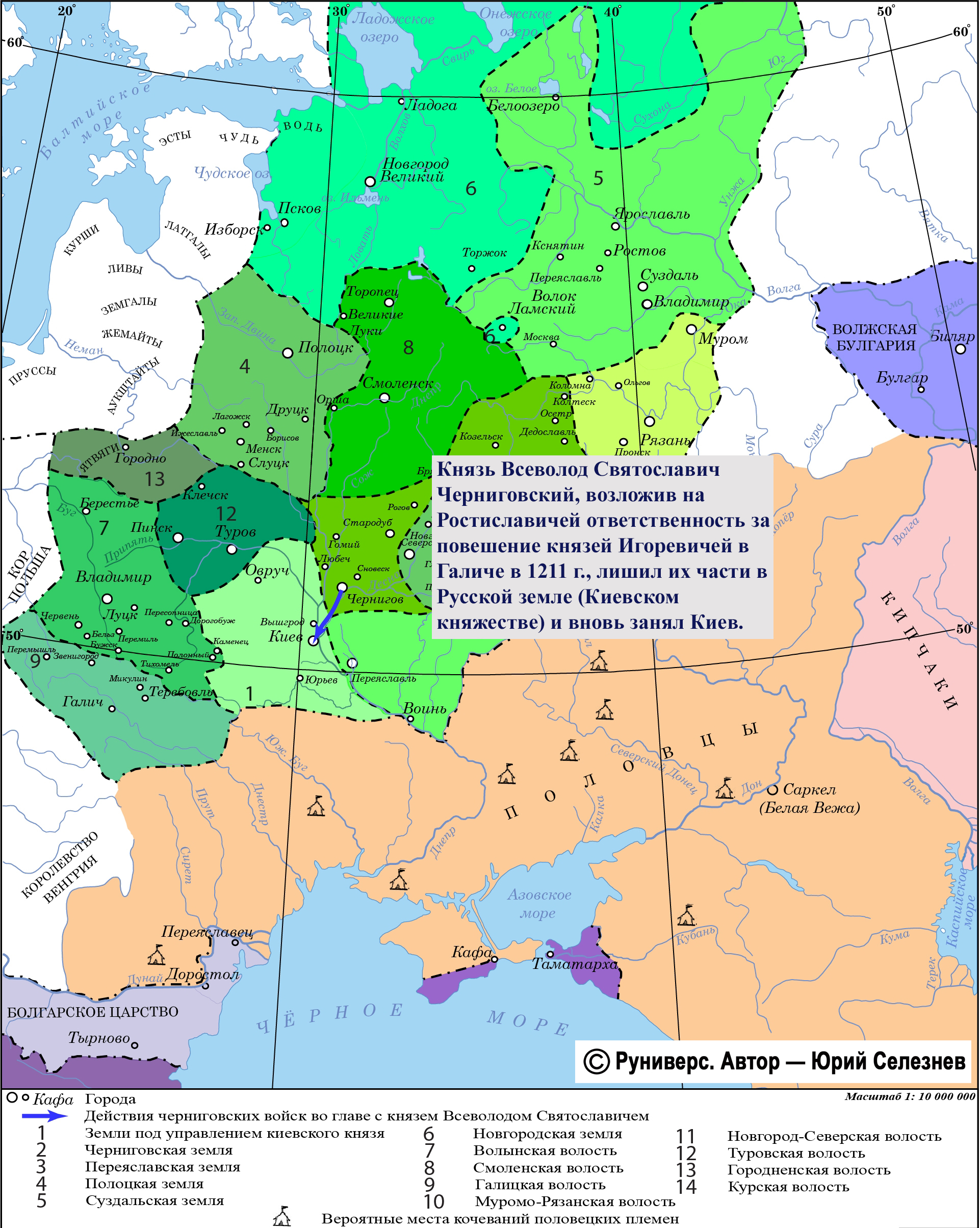 Князь Всеволод Святославич Черниговский, возложив на Ростиславичей ответственность за повешение князей Игоревичей в Галиче в 1211 г., лишил их части в Русской земле (Киевском княжестве) и вновь занял Киев.