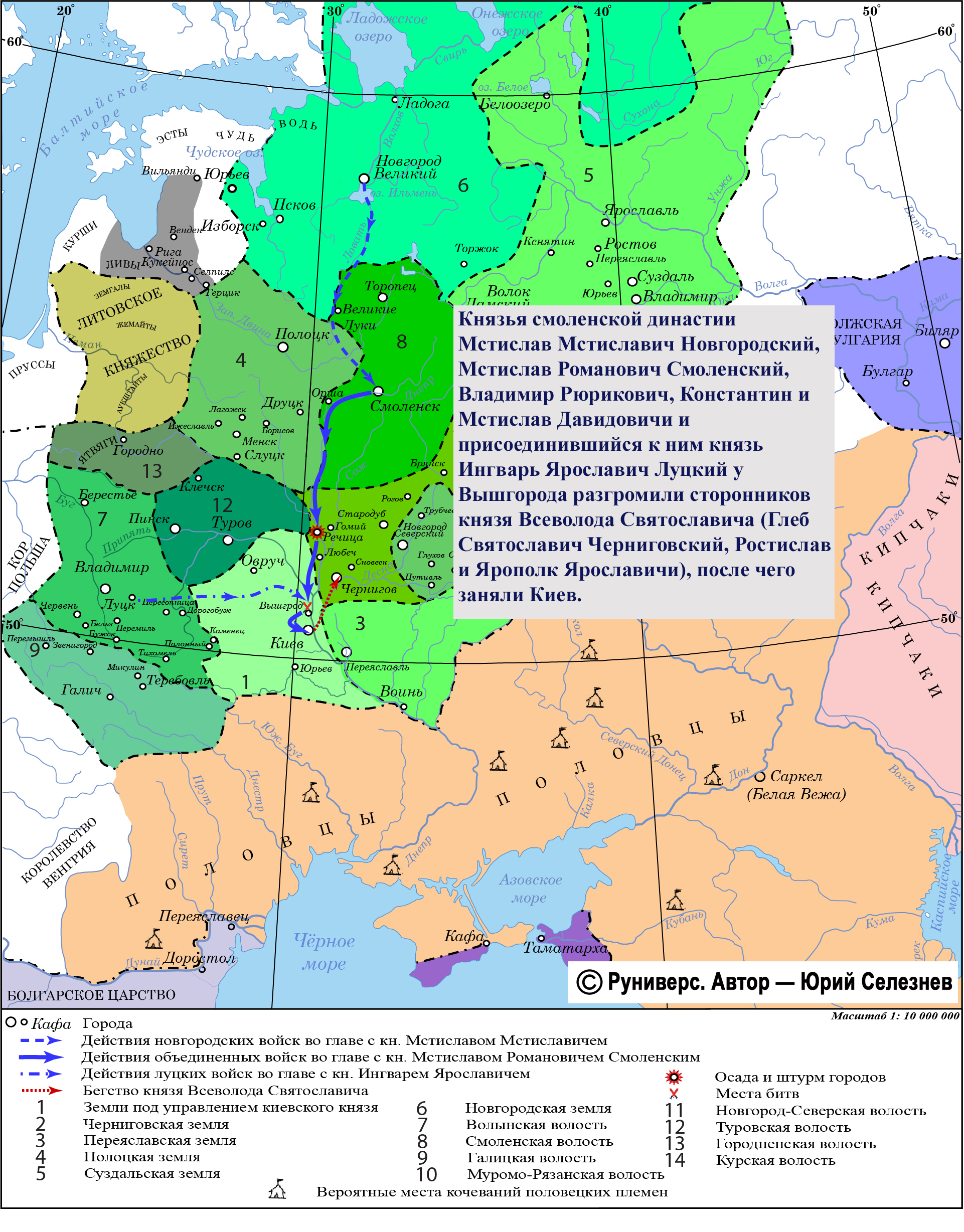 Князья смоленской династии Мстислав Мстиславич Новгородский, Мстислав Романович Смоленский, Владимир Рюрикович, Константин и Мстислав Давидовичи и присоединившийся к ним князь Ингварь Ярославич Луцкий выдвинулись к Киеву. У Вышгорода коалиция князей разгромила сторонников князя Всеволода Святославича (Глеб Святославич Черниговский, Ростислав и Ярополк Ярославичи), после чего заняла Киев.