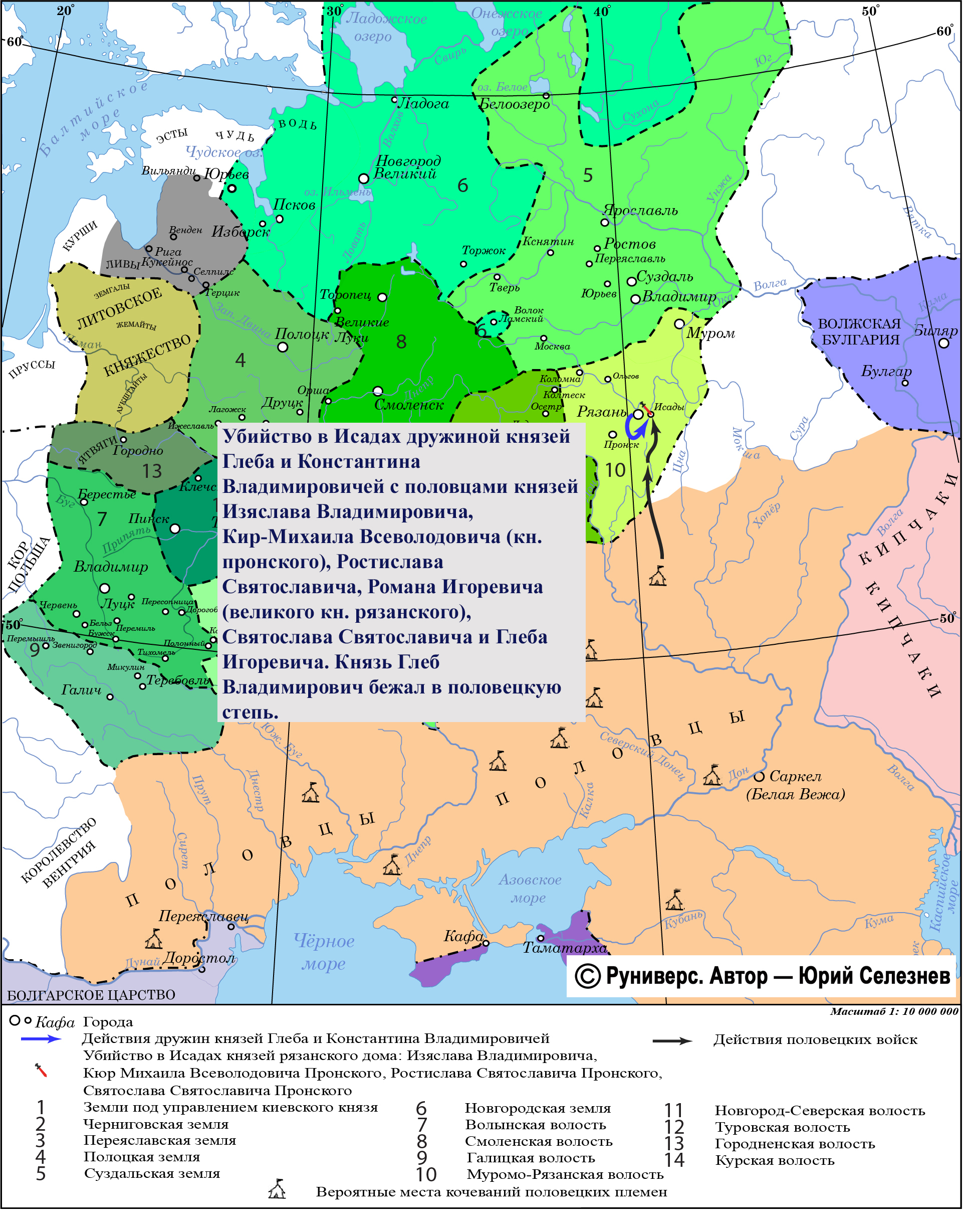 По приглашению рязанских князей Глеба и Константина Владимировичей в Исады съехались с боярами и почетной дружиной князья рязанские и пронские. Там дружина князей Глеба и Константина Владимировичей с половцами убили князей Изяслава Владимировича, Кир-Михаила Всеволодовича (князя пронского), Ростислава Святославича, Романа Игоревича (великого князя рязанского), Святослава Святославича и Глеба Игоревича. Спасся опоздавший Ингварь Игоревич, который стал княжить в Рязани. Князь Глеб Владимирович бежал в половецкую степь.
