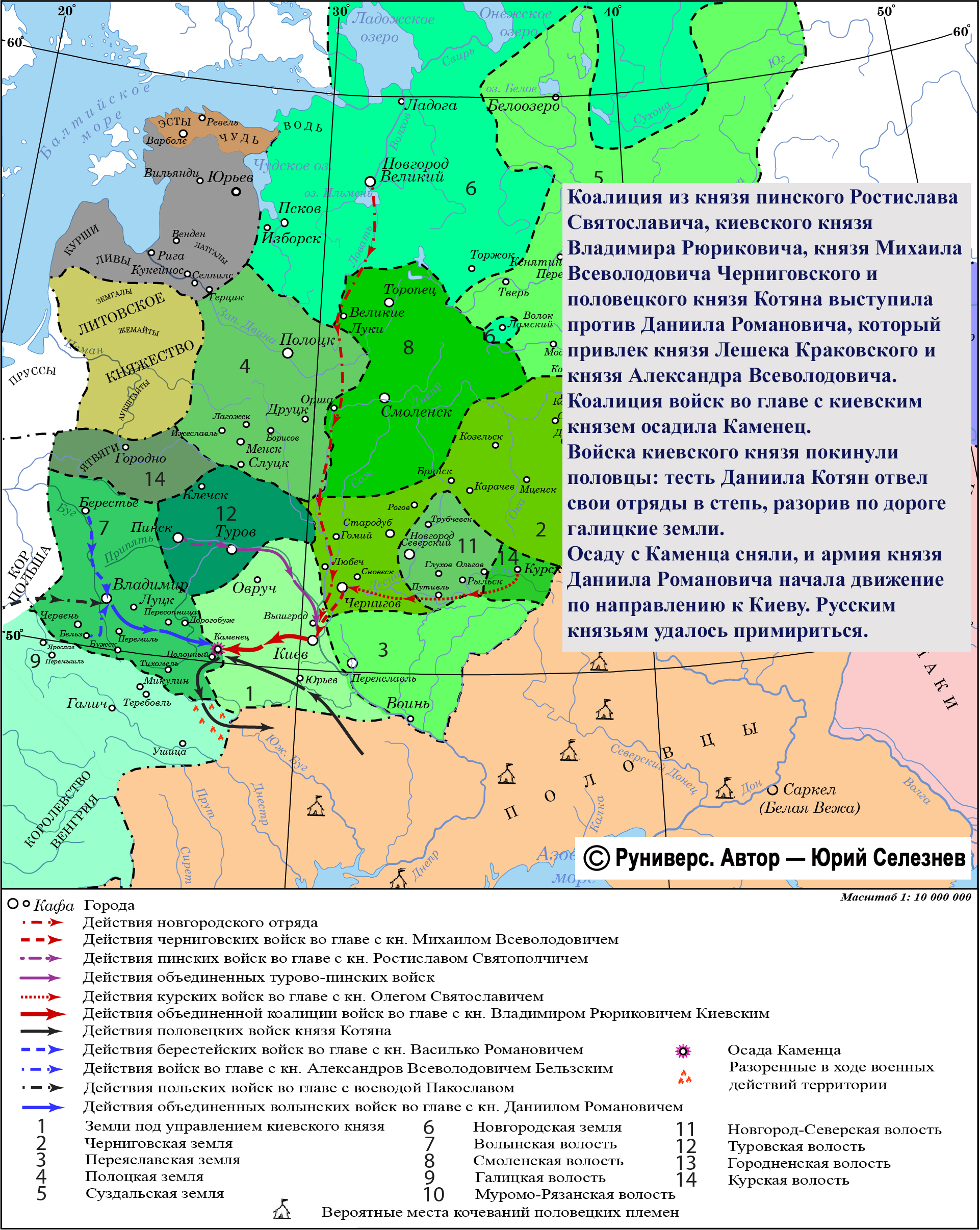 Коалиция войск во главе с киевским князем осадила Каменец. Однако здесь войска покинули половцы. Тесть Даниила Котян отвел свои отряды в Степь, разорив по дороге галицкие земли. Вскоре осаду с Каменца сняли, и армия князя Даниила Романовича начала движение по направлению к Киеву. Русским князьям удалось примириться.