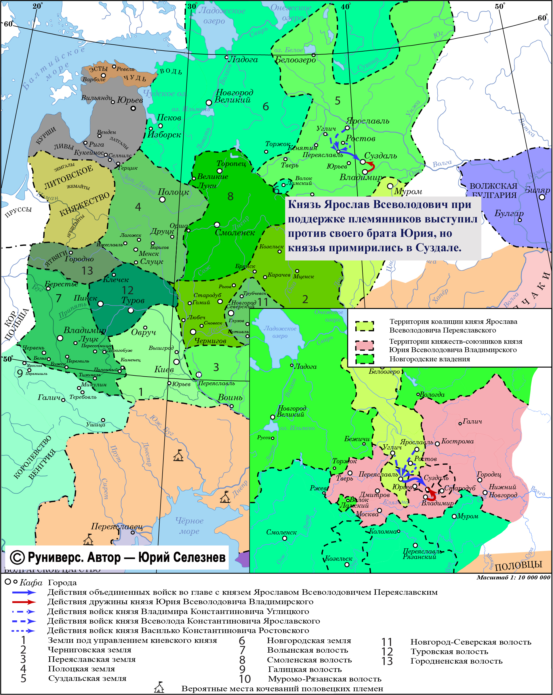 Князь Ярослав Всеволодович при поддержке племянников выступил против своего брата Юрия, заподозрив его в заговоре против брата Михаила в борьбе за влияние в Новгороде. Князь Юрий Всеволодович Владимирский, узнав об этом, позвал Ярослава с Константиновичами в Суздаль, где князья примирились.
