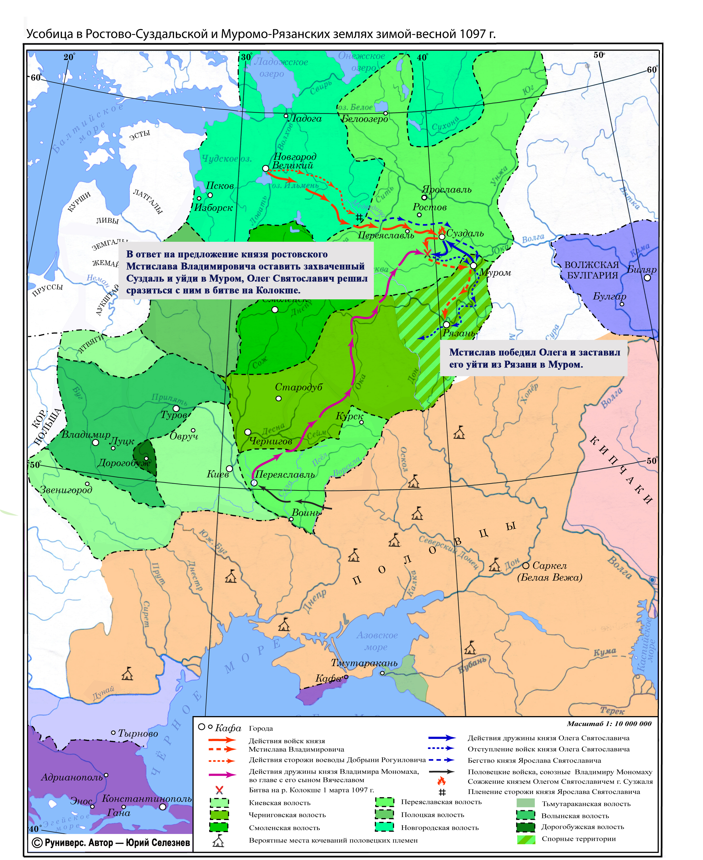 В ответ на предложение князя ростовского Мстислава Владимировича оставить захваченный Суздаль и уйди в Муром, Олег Святославич решил сразиться с ним в битве на Колокше.Мстислав победил Олега и заставил его уйти из Рязани в Муром.