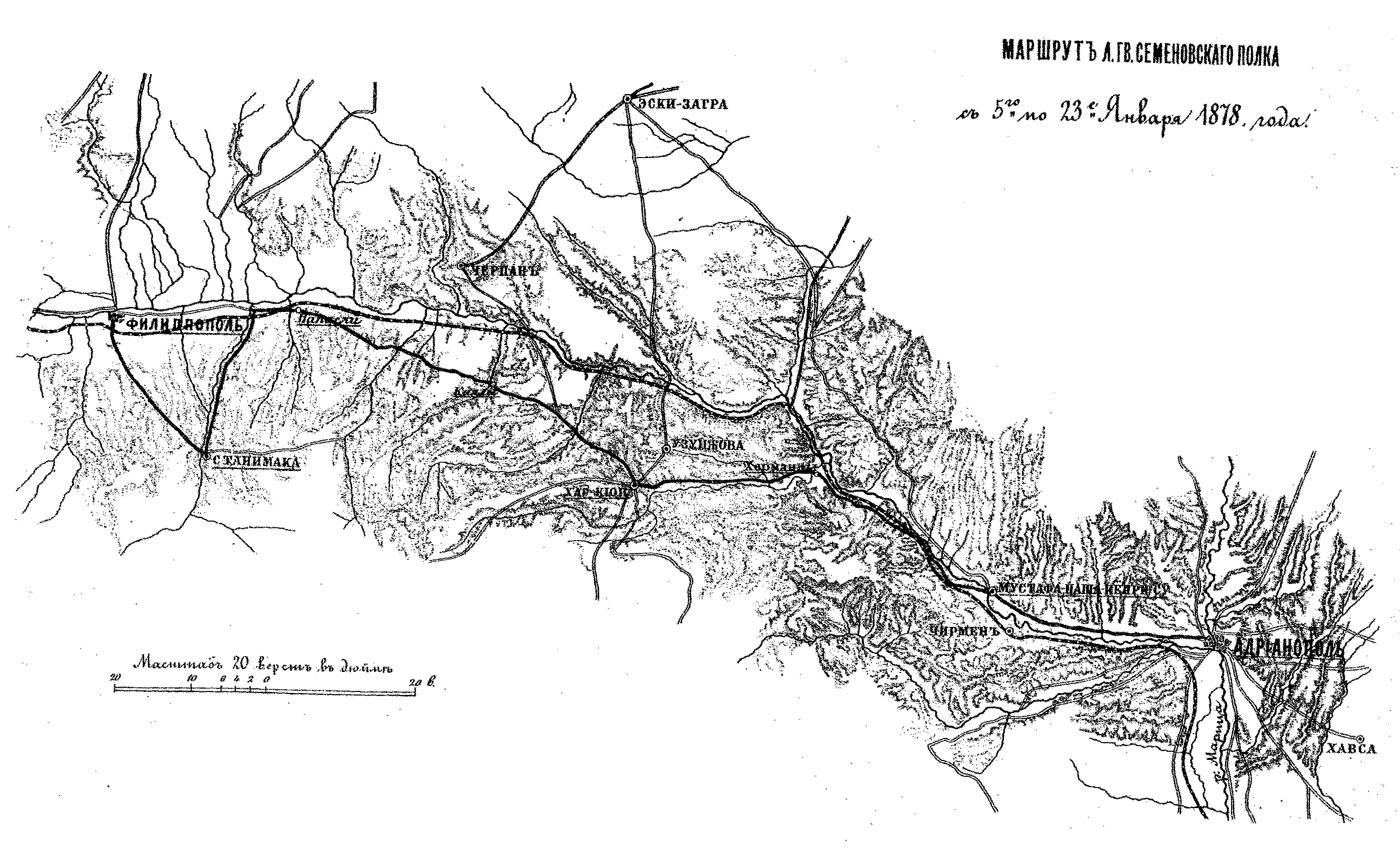 Маршрут Лейб-Гвардии Семеновского полка с 5 по 23 января 1878 года