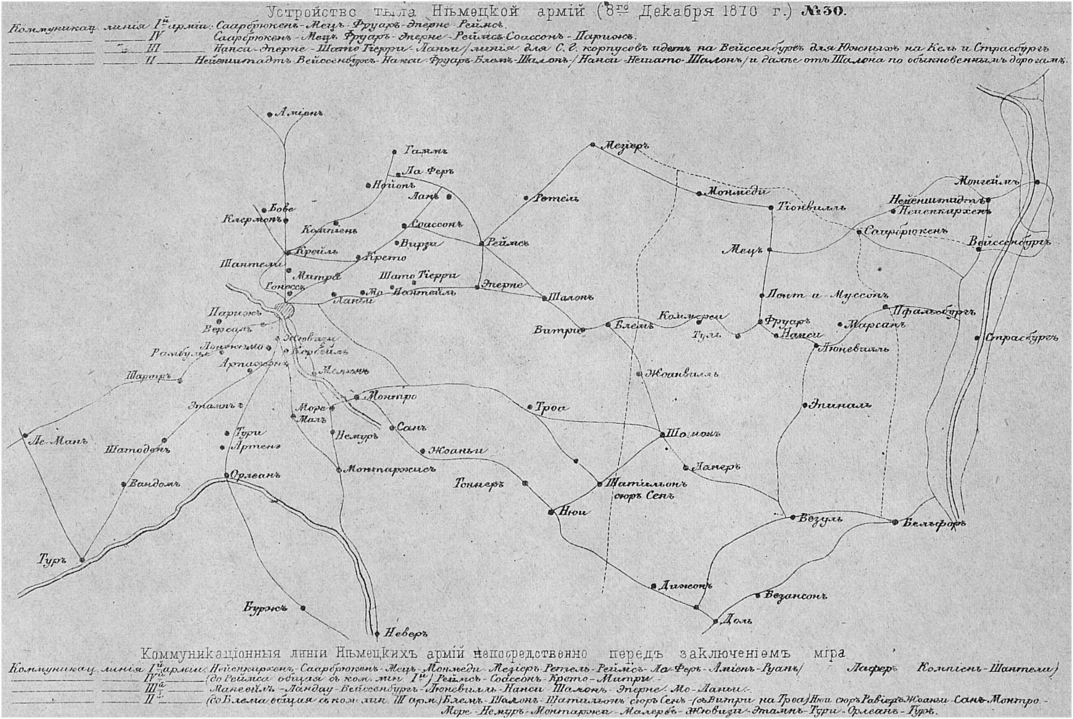Устройство тыла Немецкой армии (8 декабря 1870 года). Коммуникационные линии Немецких армий непосредственно перед заключением мира.